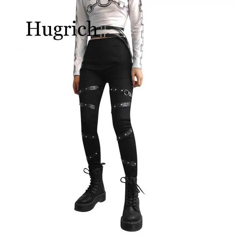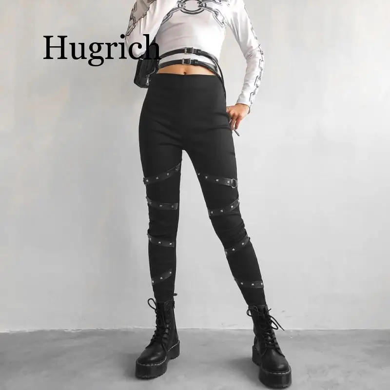 .Pictures of 2020 Women Solid Gothic Steampunk style pants Black Casual Loose Elastic Tight trousers high waist Pockets Rivet Full Pants