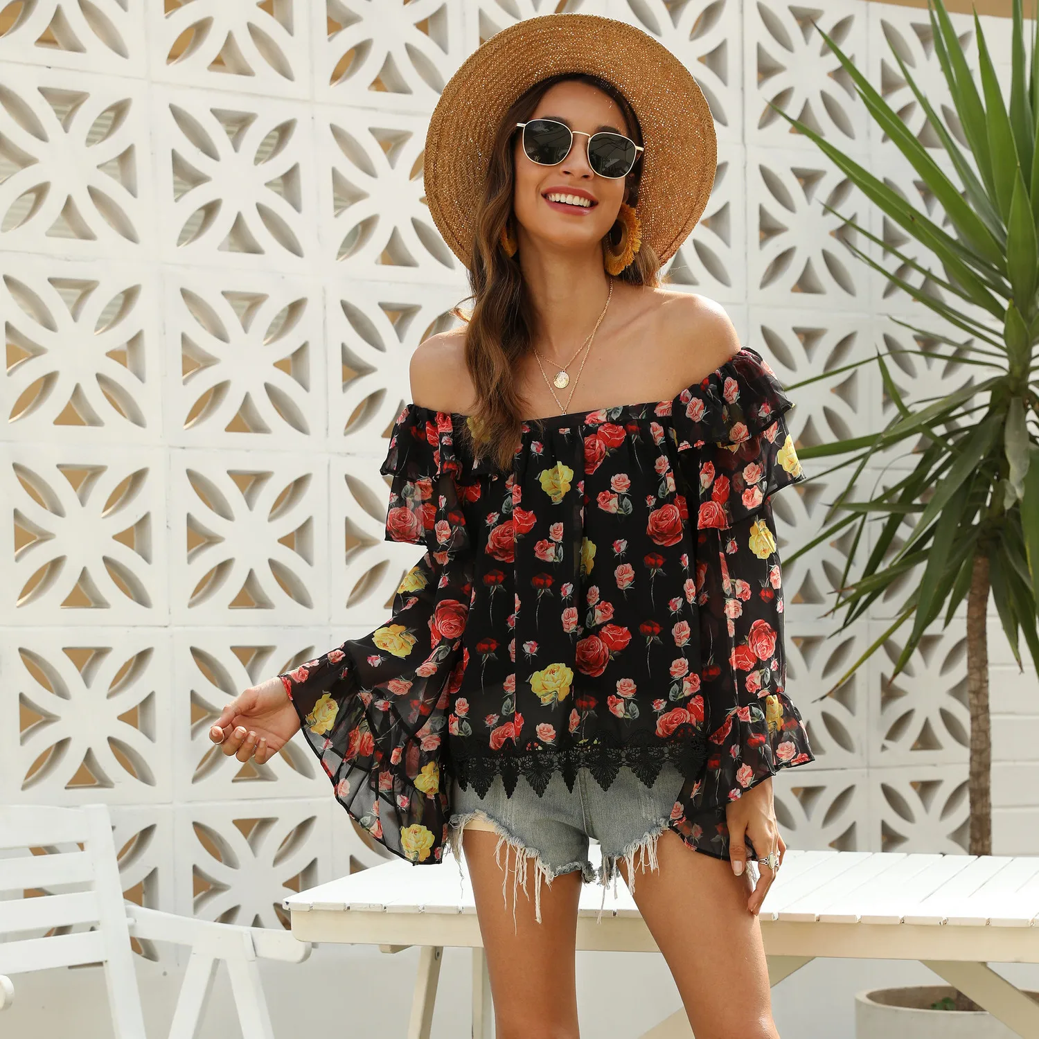 Special Offer for Casual Floral Printed Blouse Women Off Shoulder Slash Neck Full Flare Sleeve See-Through Summer Clothes Tops Camisas Mujer 2020