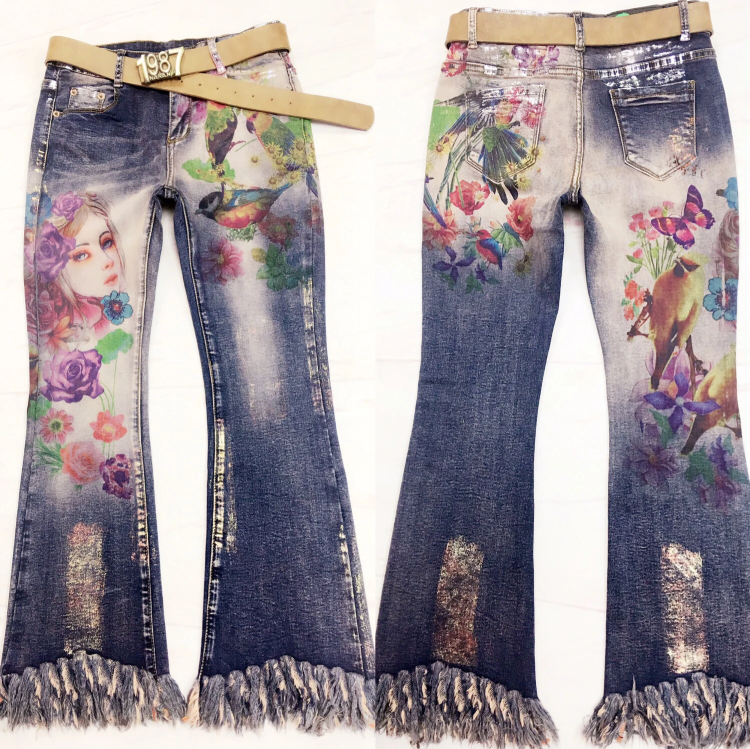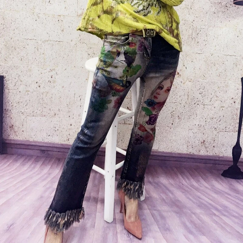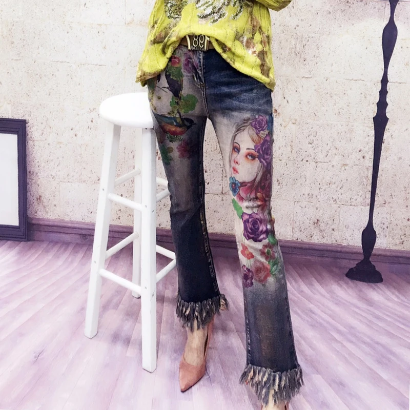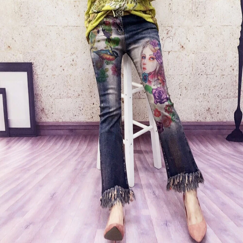 Best Flare Jeans for Women Spring Autumn New European Goods Industrial Coloured Drawing Bronze Cool Printed Trumpet Jeans Denim Pants Free Shipping