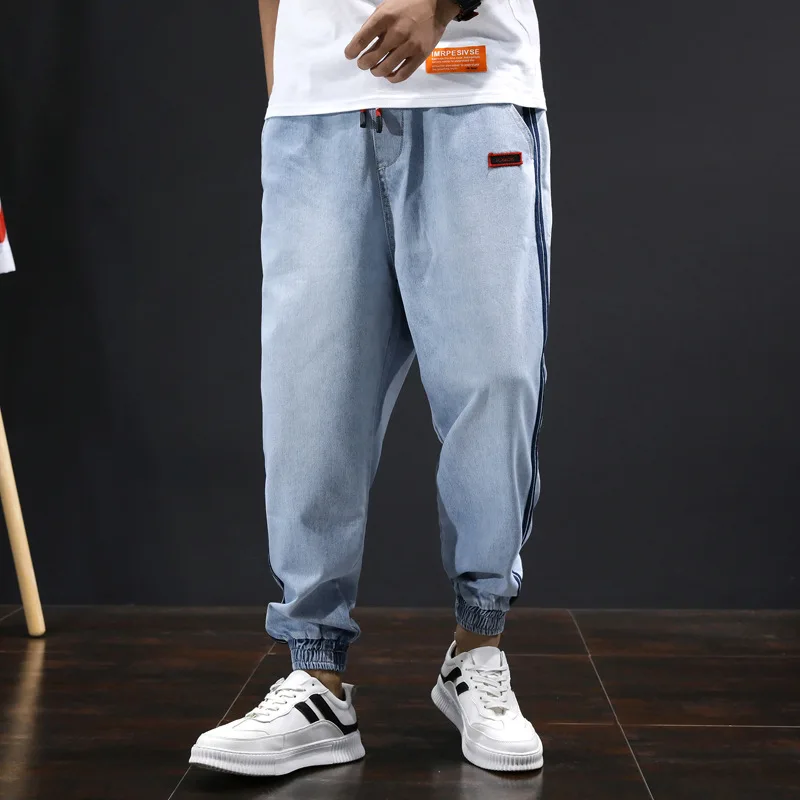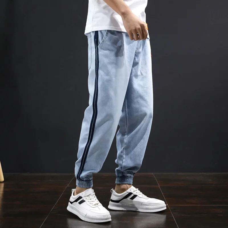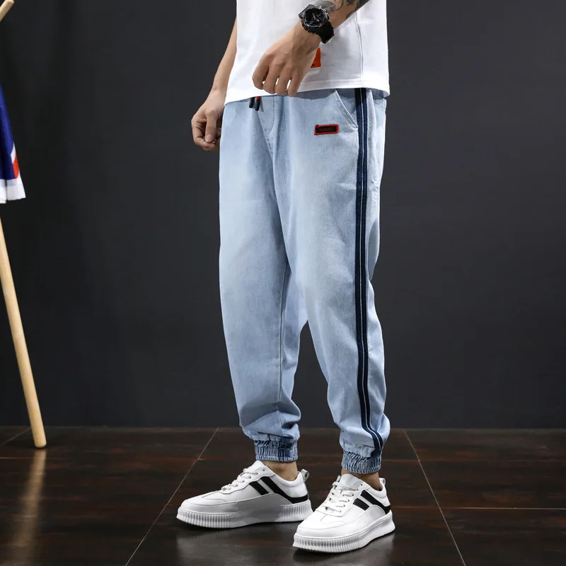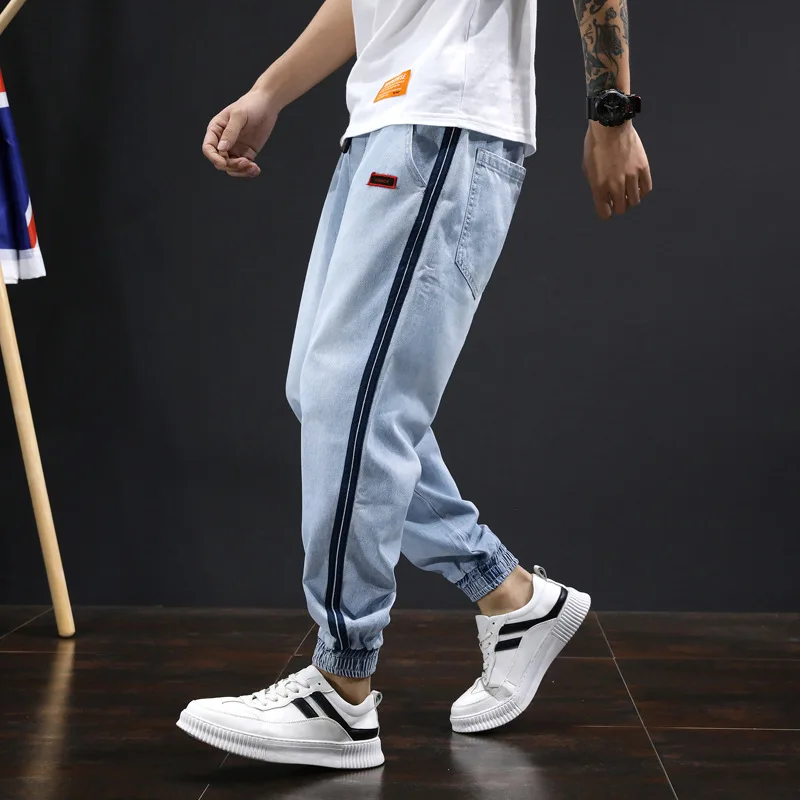 Buy Japanese Fashion Men Jeans Loose Fit Light Blue Stripe Spliced Denim Cargo Pants Slack Bottom Joggers Street Hip Hop Jeans Men Right Here and Right Now or before 2098-12-31 and You will save US $29.15 or 54%, Because before price is changed afer 2098-12-31 you will just pay for 24.83, not in Reguler Price at 53.98. Yap! This is I mean you will Save 54% / US $29.15