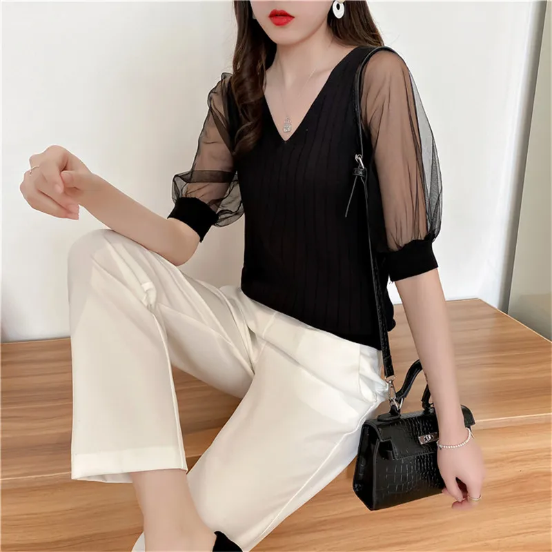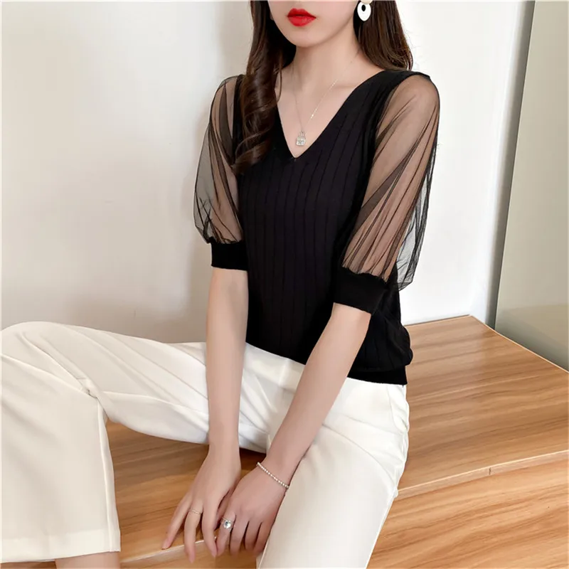 Chance Description for Korean Fashion Women Blouses Woman Knitted Tops Woman V-neck Shirt Women Mesh Patchwork Blouse Top Blusas Femininas Elegante