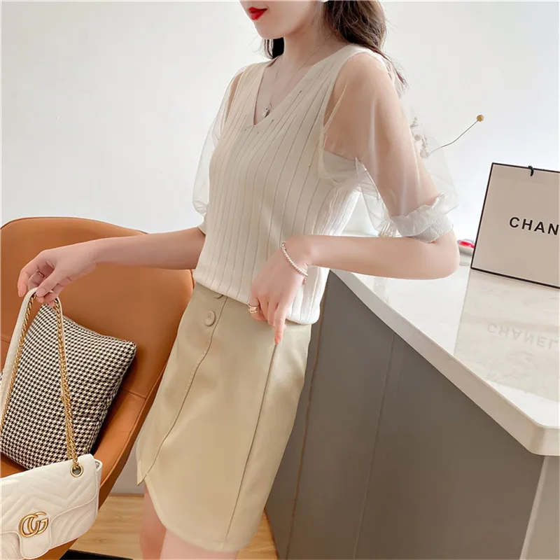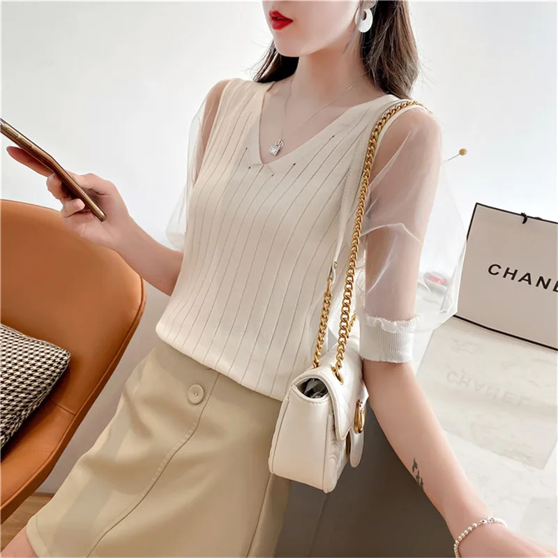 Best Offer of Korean Fashion Women Blouses Woman Knitted Tops Woman V-neck Shirt Women Mesh Patchwork Blouse Top Blusas Femininas Elegante