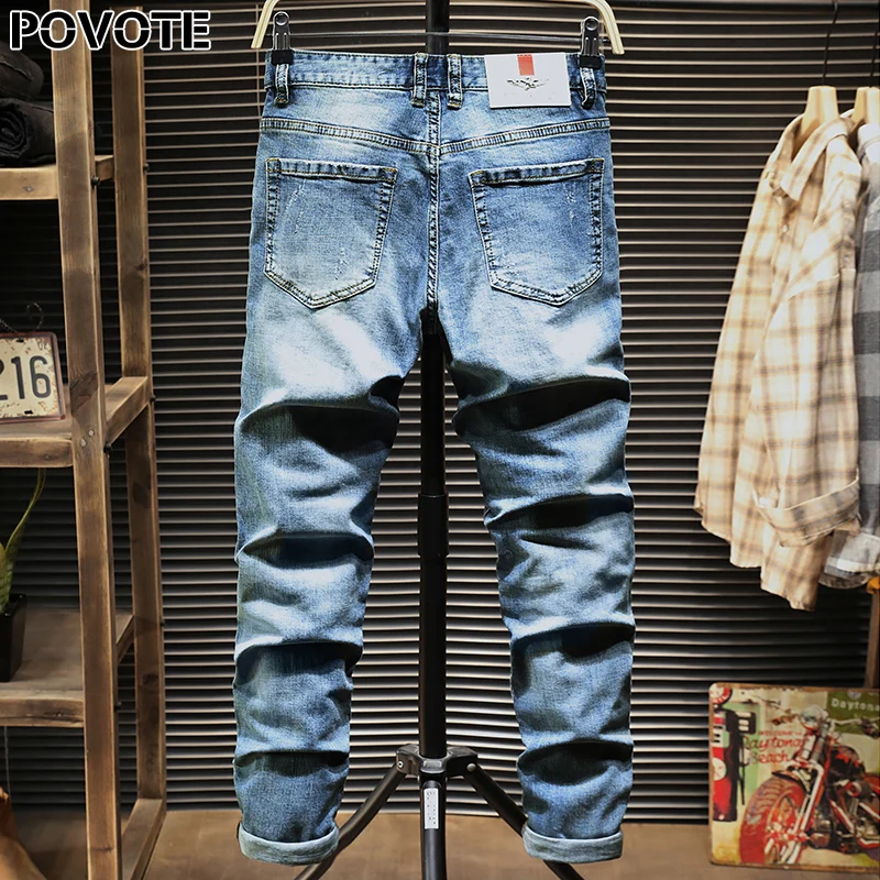 Best POVOTE jeans men's hip hop trend pants slim pencil pants men's jeans locomotive jeans cartoon embroidery trend design OSK Free Shipping