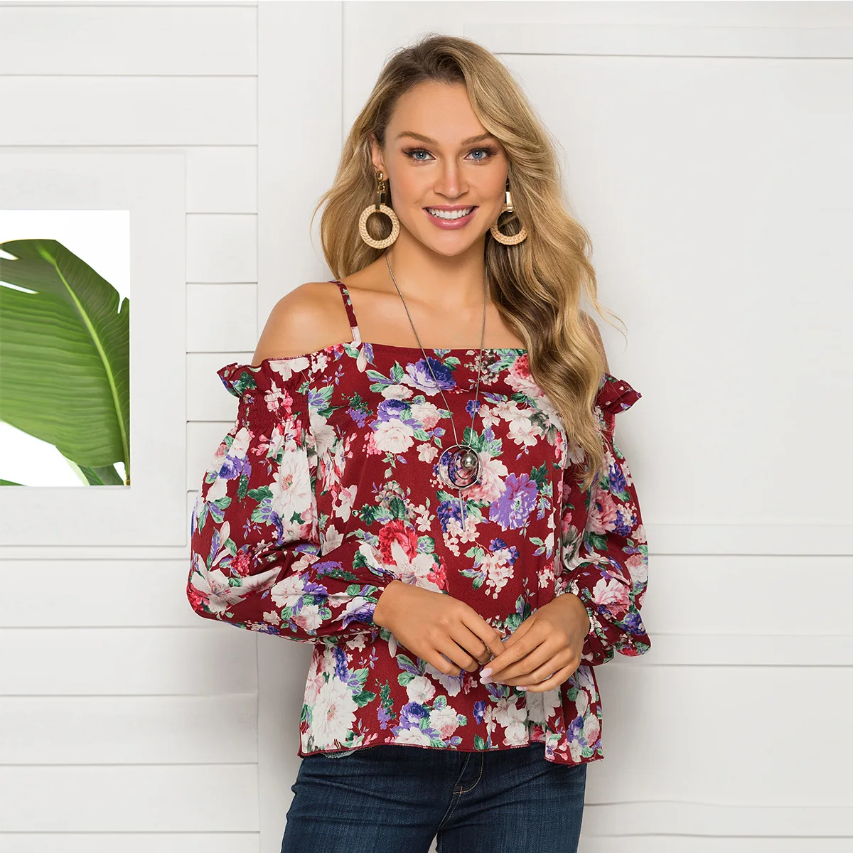 Best Sexy Floral Printd Blouse Women Slash Neck Full Lantern Sleeve Spaghetti Straps Casual Summer Tops Clothes Ropa De Mujer 2020 Free Shipping