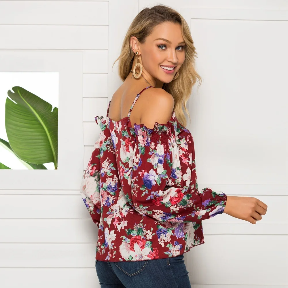 .Gallery for Sexy Floral Printd Blouse Women Slash Neck Full Lantern Sleeve Spaghetti Straps Casual Summer Tops Clothes Ropa De Mujer 2020