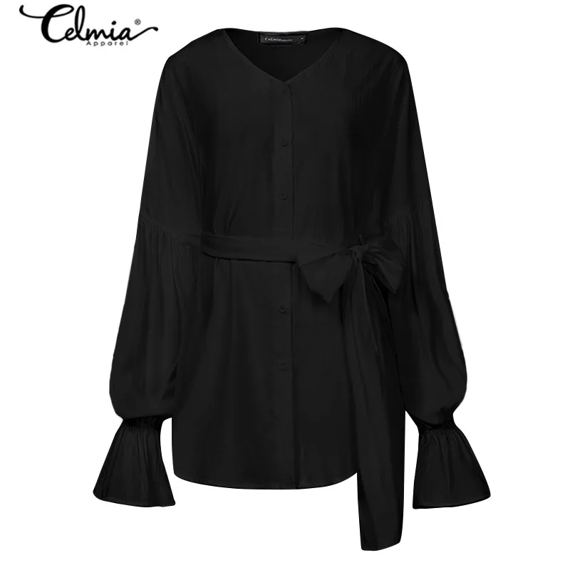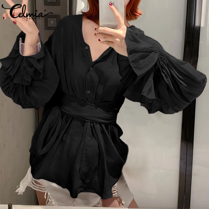 Limited Chance of Celmia 2020 Fashion Women Long Lantern Sleeve Blouse Casual Shirts Elegant V neck Office Lady Top Belted Party Blusas Femininas