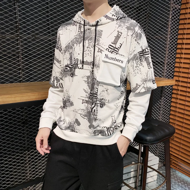 Hip Hop Hoodie Men's Fashion Cartoon Printing Fake Two Sweatshirts Men Streetwear Wild Loose Cotton Hoodie Mens Hoody M-XL
