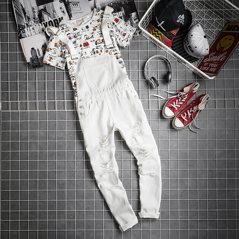 .Pictures of Mens Streetwear Vintage Distressed Denim Bib Overall for Men Ripped Jean Jumpsuit Jeans Male Suspender Denim Pants Black White