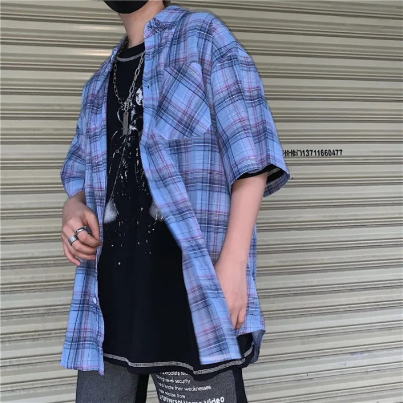 Offer Description of Summer Plaid Shirt Men's Fashion Retro Casual Shirt Men Wild Loose Short Sleeve Shirts Mens Streetwear Couple Shirt M-XL