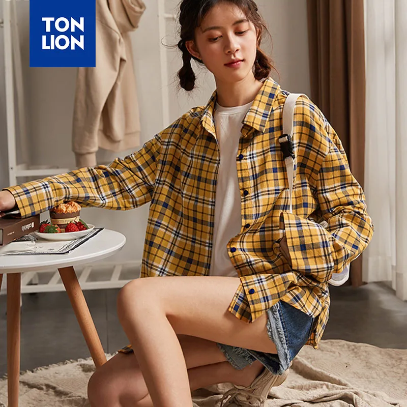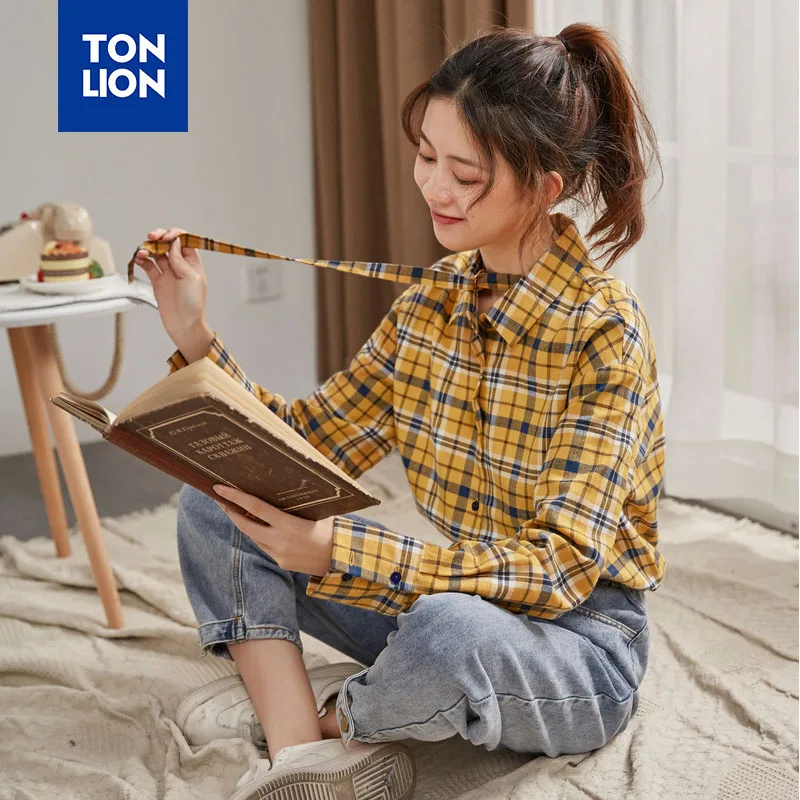 .Gallery for TONLION Yellow Purple Long Sleeve Plaid Shirt Women Full Sleeve Casual Shirts for Women Grils Fashion korean Spring Blouse 2020