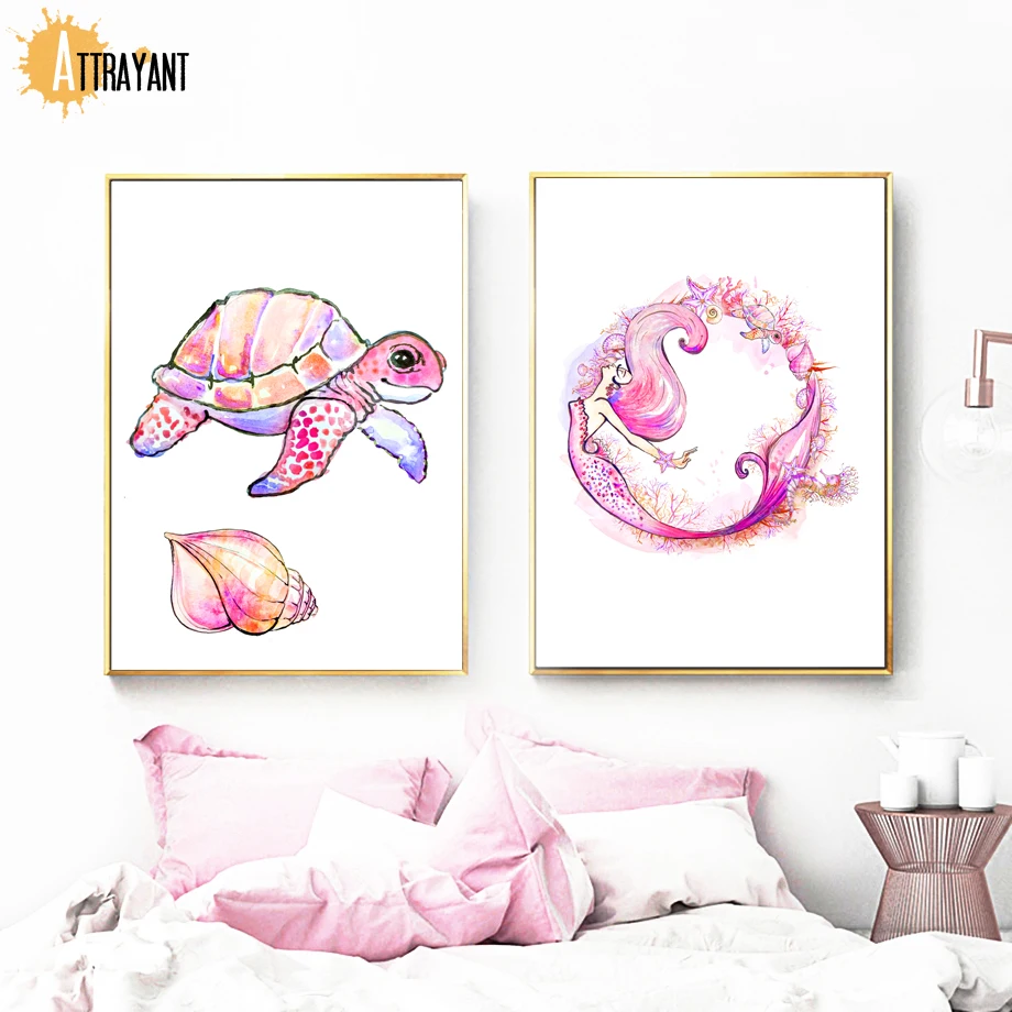 Best Color Sea Turtle Coral Mermaid Wall Art Canvas Painting Nordic Posters And Prints Animal Wall Pictures Kids Boy Girl Room Decor Free Shipping