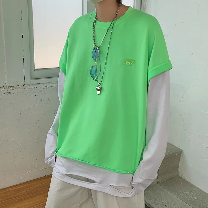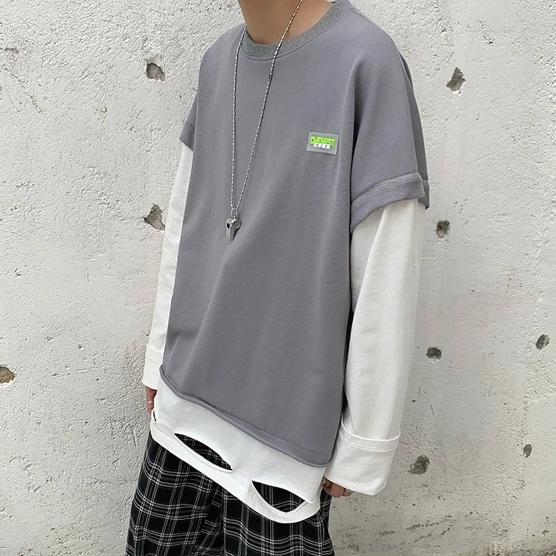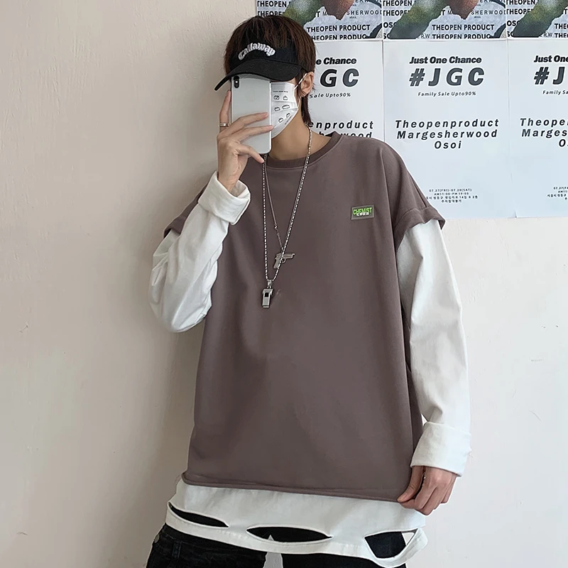 Spring Hoodie Men's Fashion Solid Color Casual O-neck Sweatshirt Men Streetwear Wild Loose Hip Hop Fake Two Hoodies Mens M-2XL