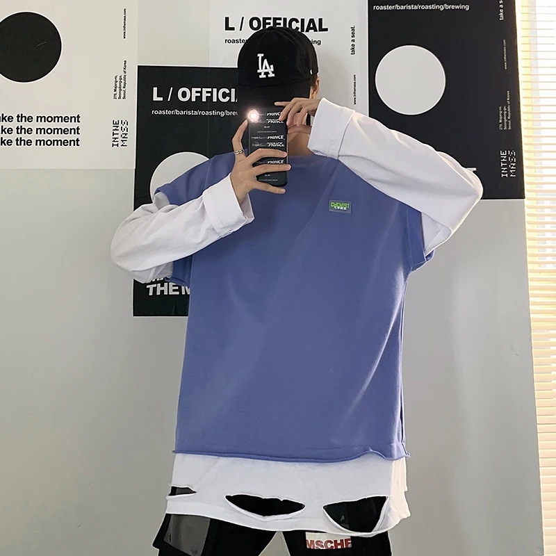 Best Cotton Hoodies Men's Fashion Hit Color Fake Two Hole Hip Hop Hoodie Men Streetwear Wild Loose O-neck Loose Sweatshirt Mens Hoody Free Shipping