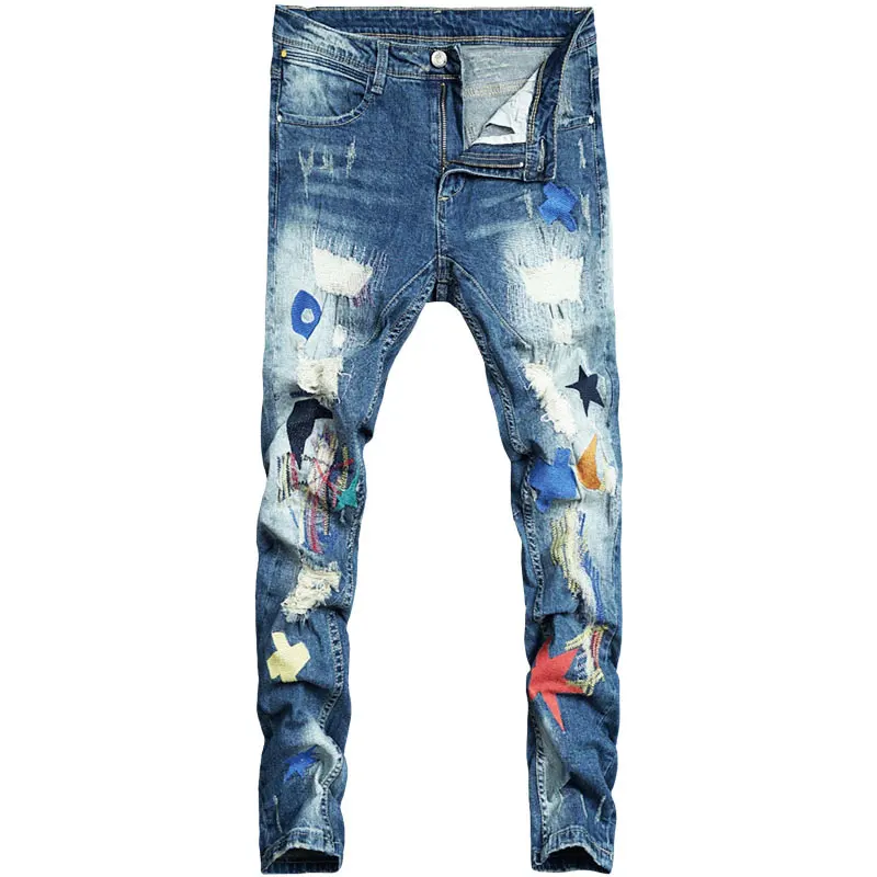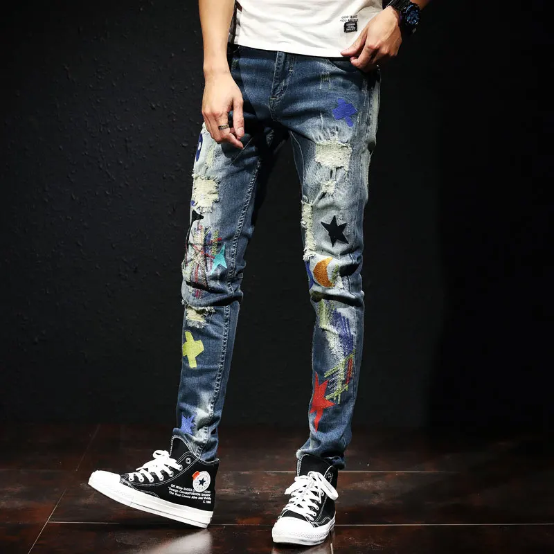 Best Korean Fashion Men Jeans Elastic Destroyed Baggy Pants Stretch Ripped Jeans Men Embroidery Patches Designer Hip Hop Jeans Homme Free Shipping