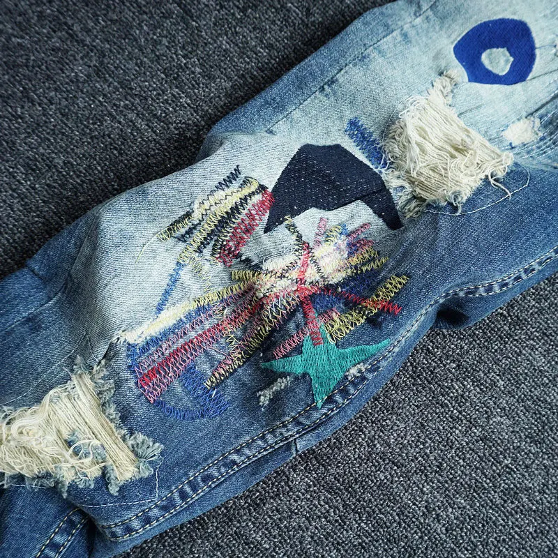 Addition Information of Korean Fashion Men Jeans Elastic Destroyed Baggy Pants Stretch Ripped Jeans Men Embroidery Patches Designer Hip Hop Jeans Homme
