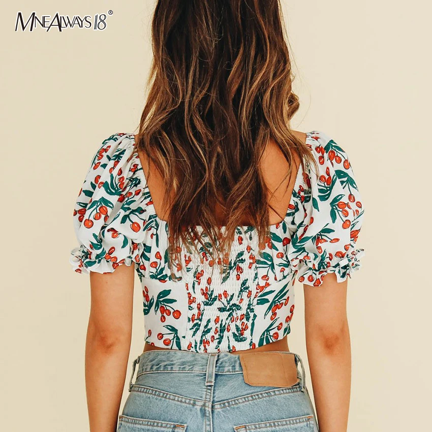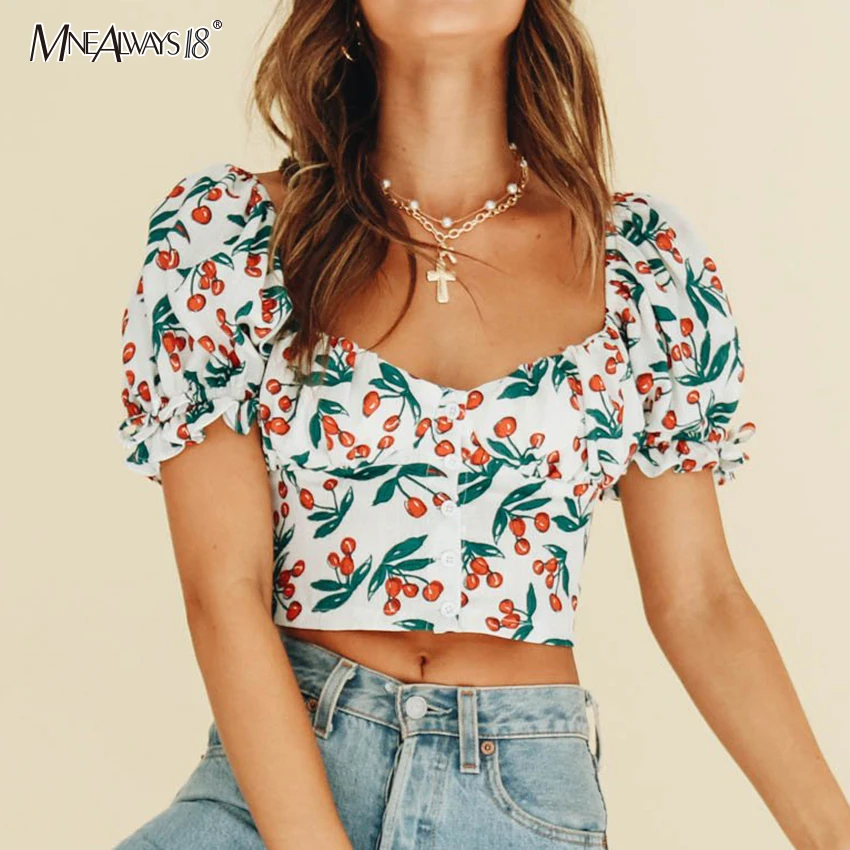 Best Mnealways18 Cherry Floral Print Blouse Square Collar Puff Sleeve Frill Ruffle Sexy Crop Top Sweet Women Shirt Top Female Casual Free Shipping
