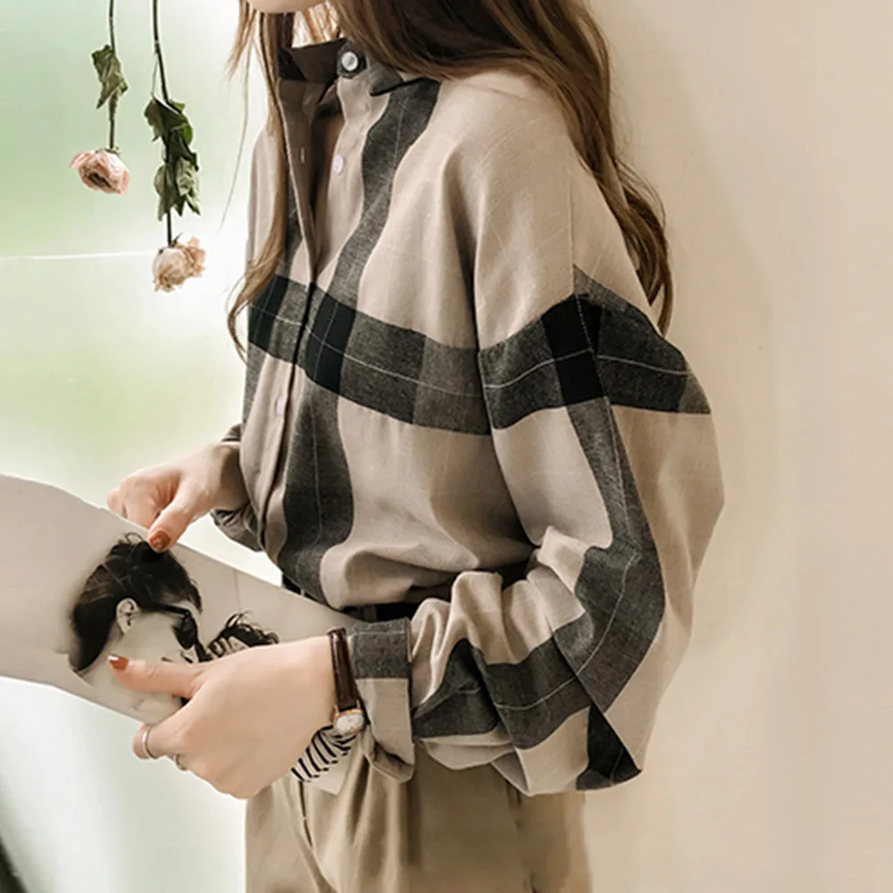 Price Description of Women 2020 Spring Plaid Color Block Shirt Female Chic Top Autumn Causal Blouse Korean Boyfriend Streetwear Office Lady Cool