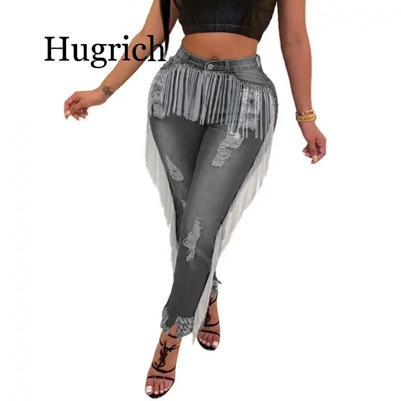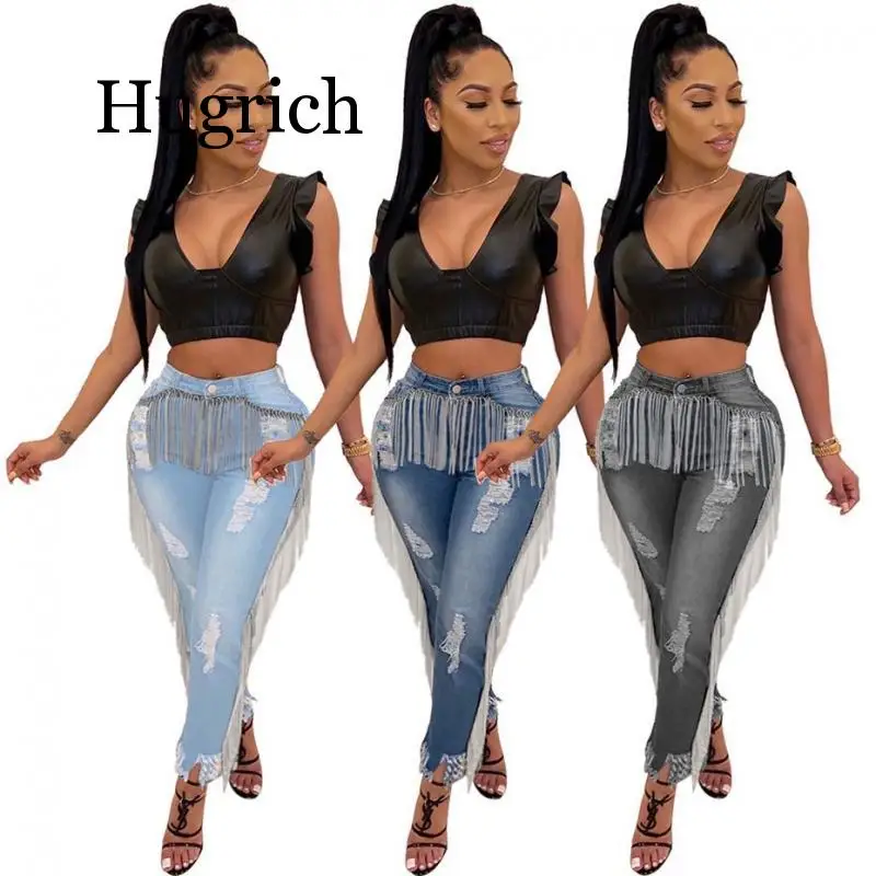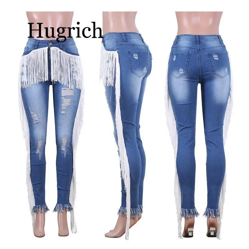 .Pictures for 2020 Fringe High Waist Ripped Jeans for Women Autumn Stretch Skinny Denim Pants Plus Size Elegant Tassel Vintage Blue Jeans