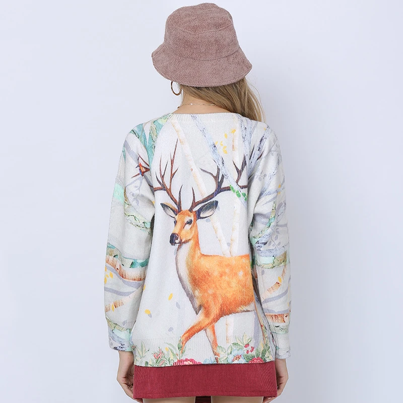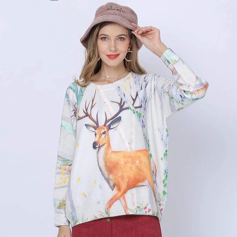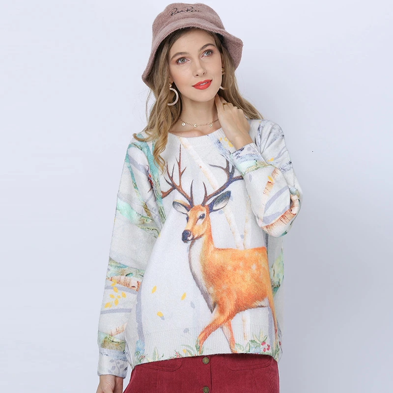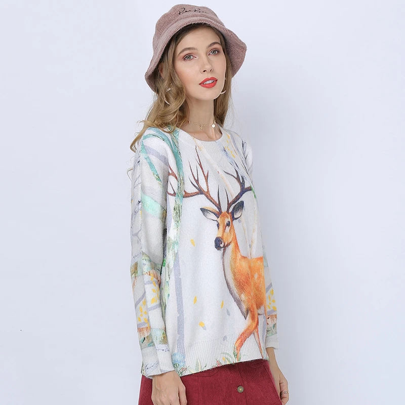 .Pictures of Fashion Milu Pattern Printed Women Sweater 2020 Autumn Winter Loose Knitting Pullovers Ladies Casual Jumper Tops New Ropa Mujer