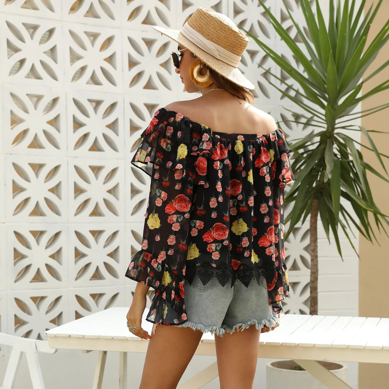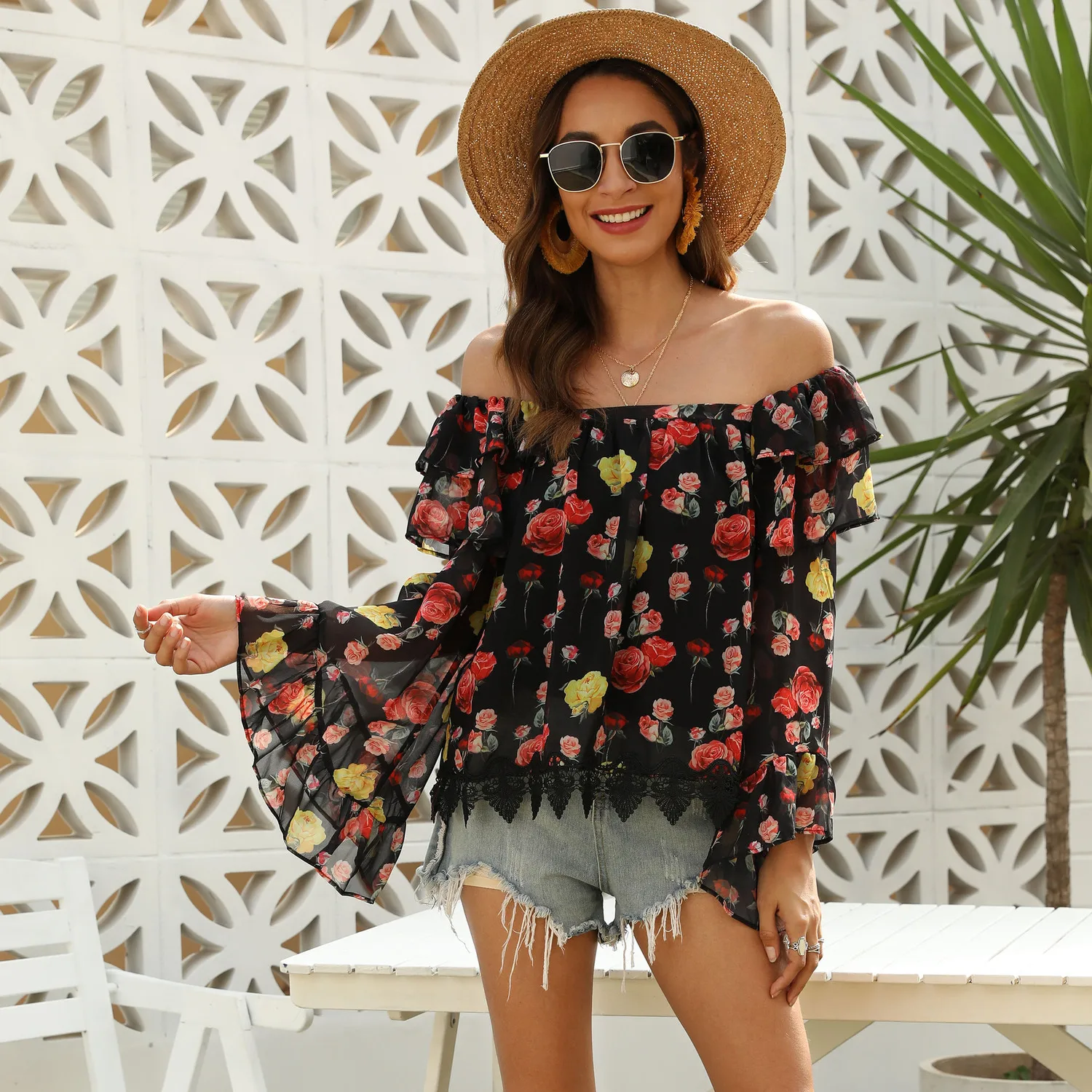.Gallery of Sexy Floral Printed Black Blouse Women Off Shoulder Ruffles Full Flare Sleeve Ruched See-Through Summer Shirt Clothes Ropa Mujer