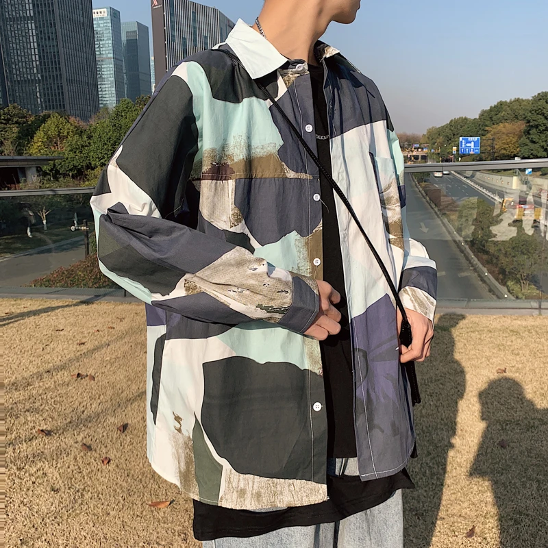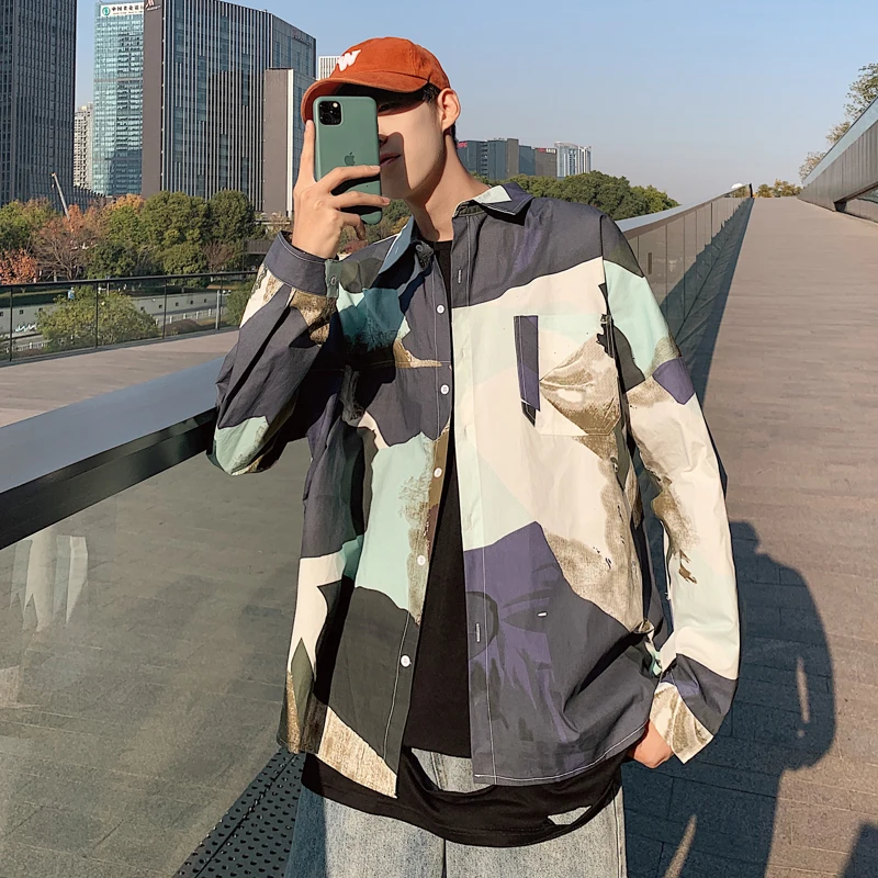 .Gallery of Spring Camo Shirt Men's Fashion Printed Cotton Casual Shirt Men Streetwear Wild Loose Long-sleeved Shirts Mens Large Size M-5XL