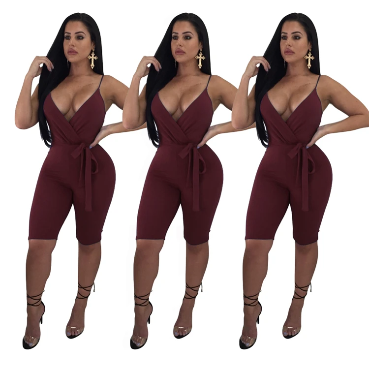 .Pictures of Women Jumpsuits Solid Color Spaghetti Strap Bandage V-Neck Knee Length Rompers Sexy Casual Club Fashion Jumpsuit Ladies Playsuit
