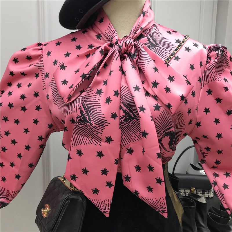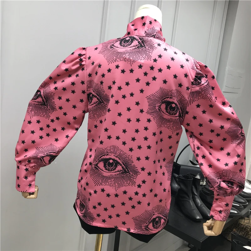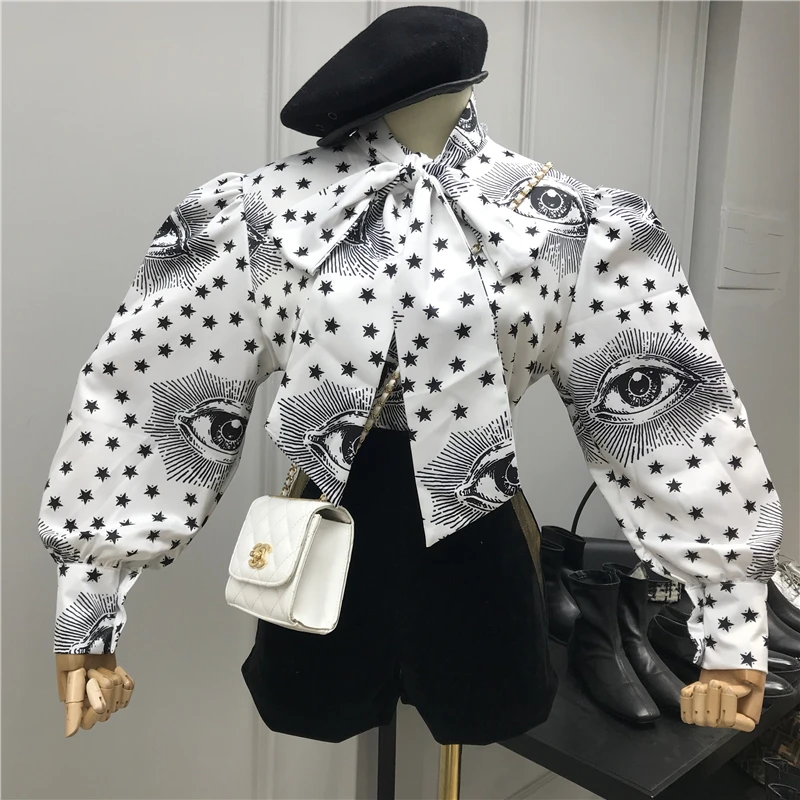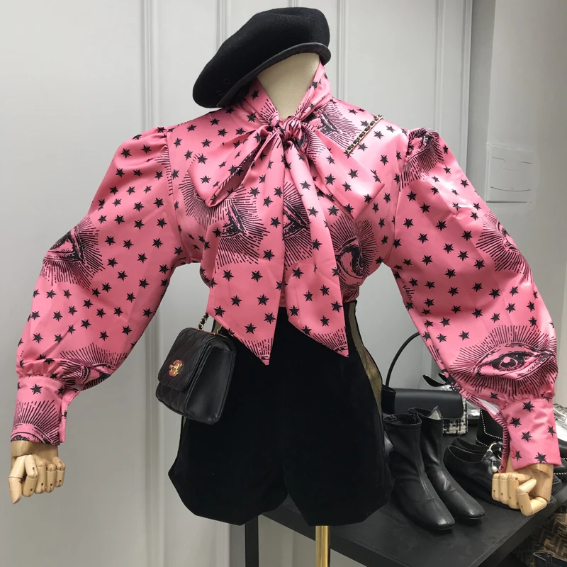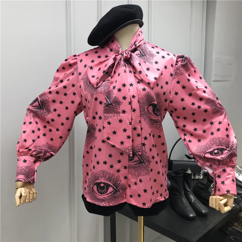 .Gallery of Big Bow Collar Blouse Women 2019 Winter Fashion Star Eyes Print Lace-up Bow Puff-Sleeve Shirt Women's Loose Blouse Blusas Femme