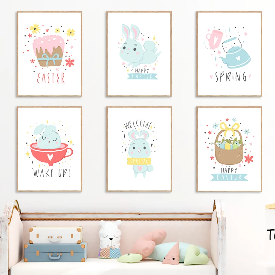 Best Rabbit Cup Flower basket Cartoon Animal Wall Art Canvas Painting Nordic Posters And Prints Wall Pictures Baby Kids Room Decor Free Shipping