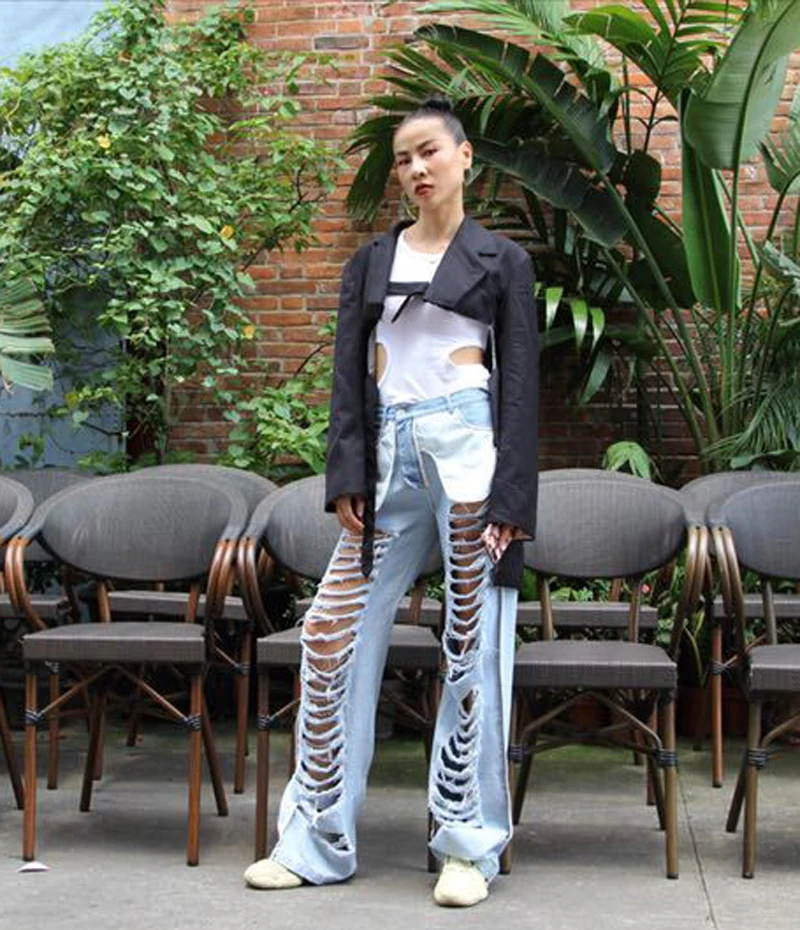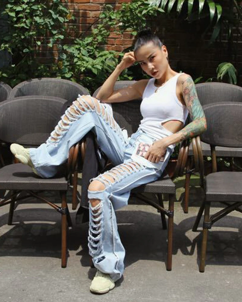 Addition Information of Beach Style Full Long Pants Women Streetwear Broad-legged Long Denim Pants Female Summer Personality Holes Jeans Female Lady