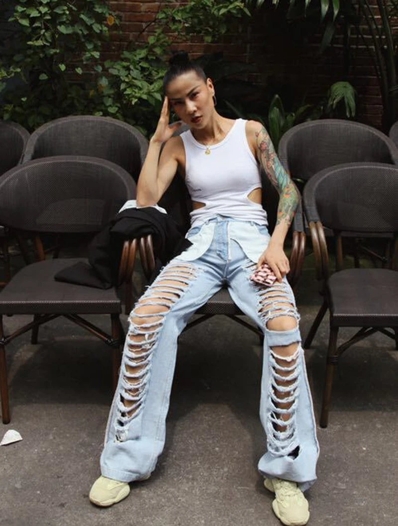 .Images of Beach Style Full Long Pants Women Streetwear Broad-legged Long Denim Pants Female Summer Personality Holes Jeans Female Lady