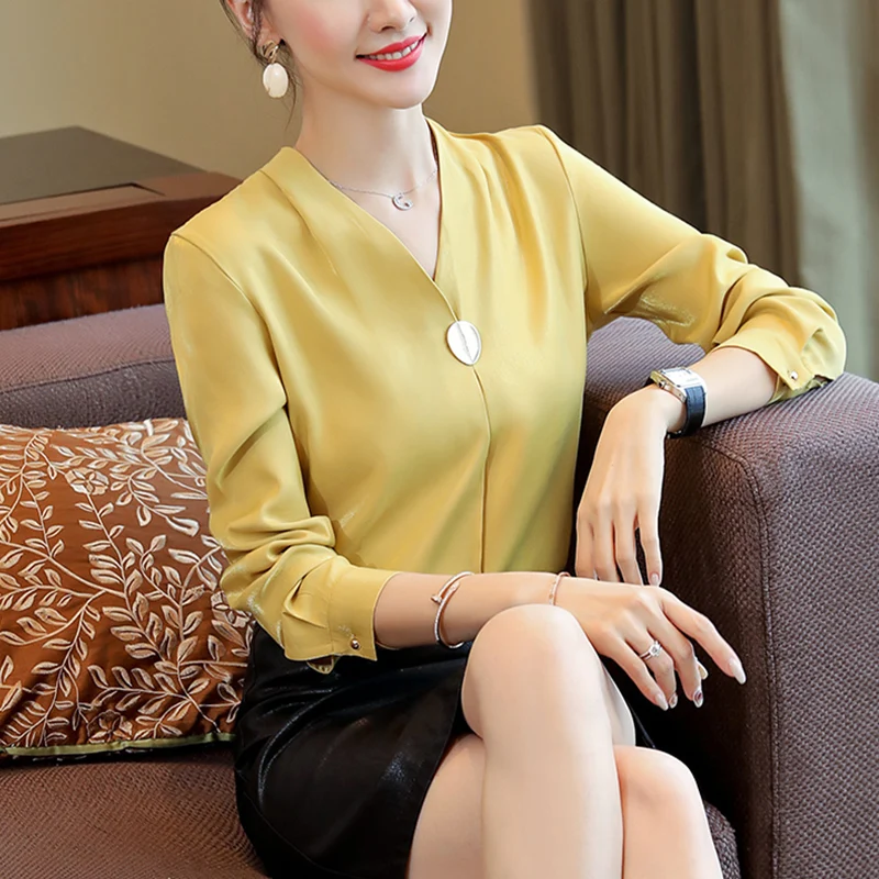 Cheap Korean Fashion Silk Women Blouses Satin V-Neck Long Sleeve Women Shirts Plus Size XXL Blusas Femininas Elegante Ladies Tops Free Shipping