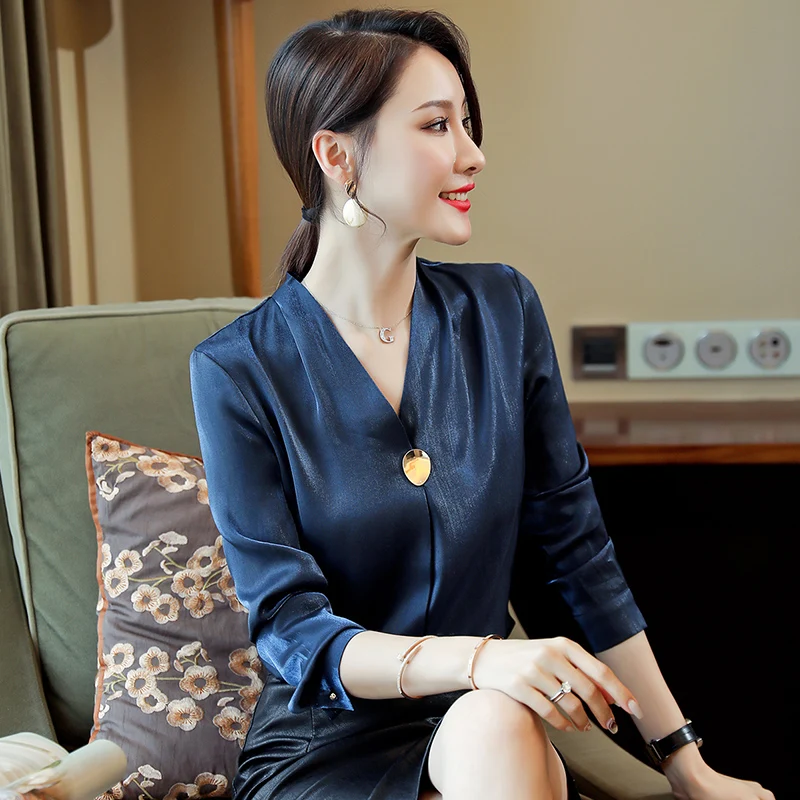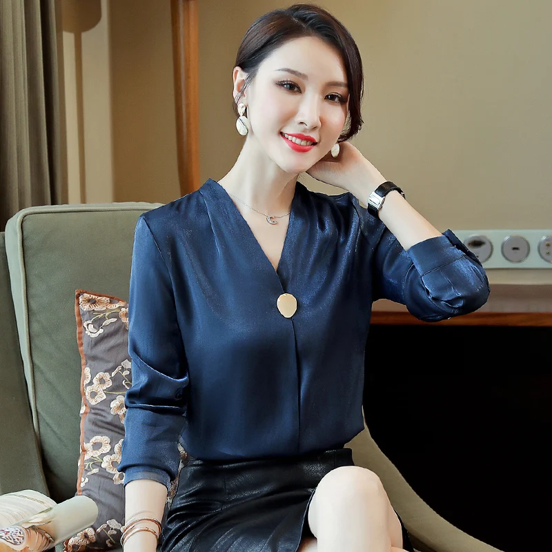 Cheap Price of Korean Fashion Silk Women Blouses Satin V-Neck Long Sleeve Women Shirts Plus Size XXL Blusas Femininas Elegante Ladies Tops