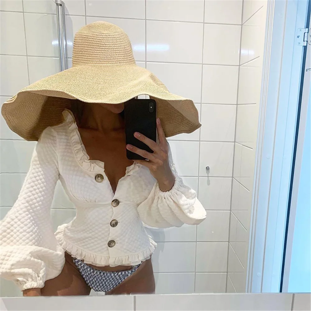 Chance Description for Three Ratels 2020 Women Fashion Solid White Textured Blouse Long Lantern Sleeve Breasted Fungus Cropped Shirts Casual Crop Top