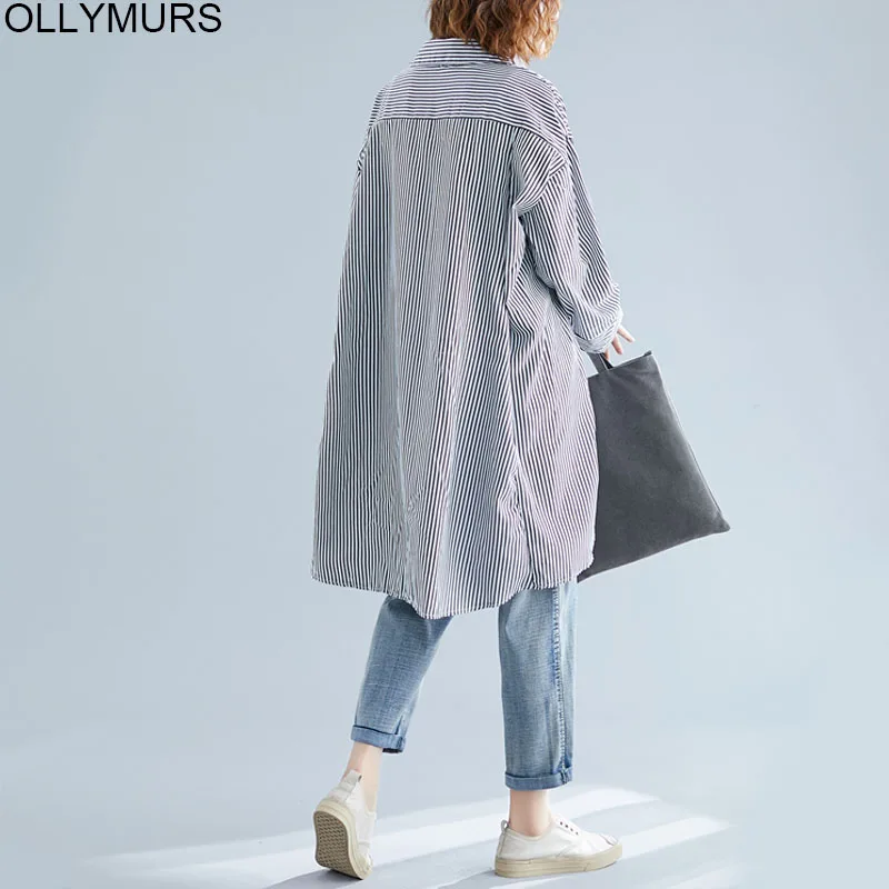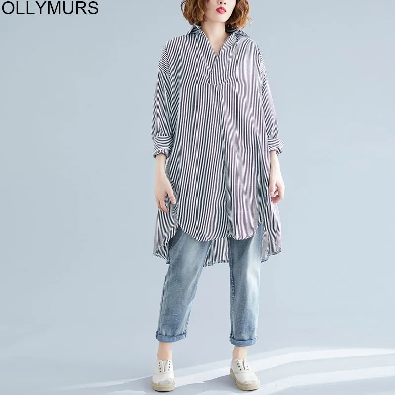 .Pictures of Autumn Winter 2019 Plus Size Striped Shirt Dress Women Blouse Vintage Loose Long Sleeve Cotton Long Shirts Blouses 4XL 5XL 6XL