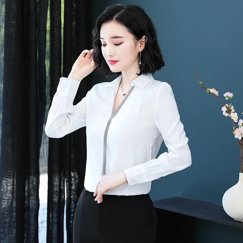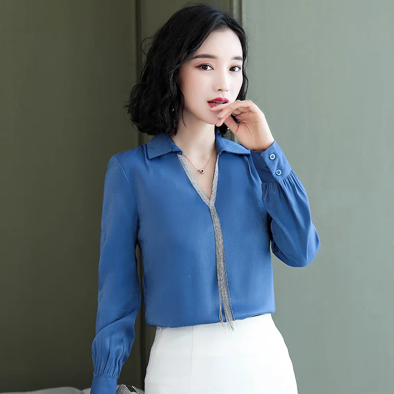 .Pictures of Korean Chiffon Women Shirts Women Long Sleeve Blouses Shirt Elegant OL V-neck Shirt Plus Size Blusas Mujer De Moda Women Blouses