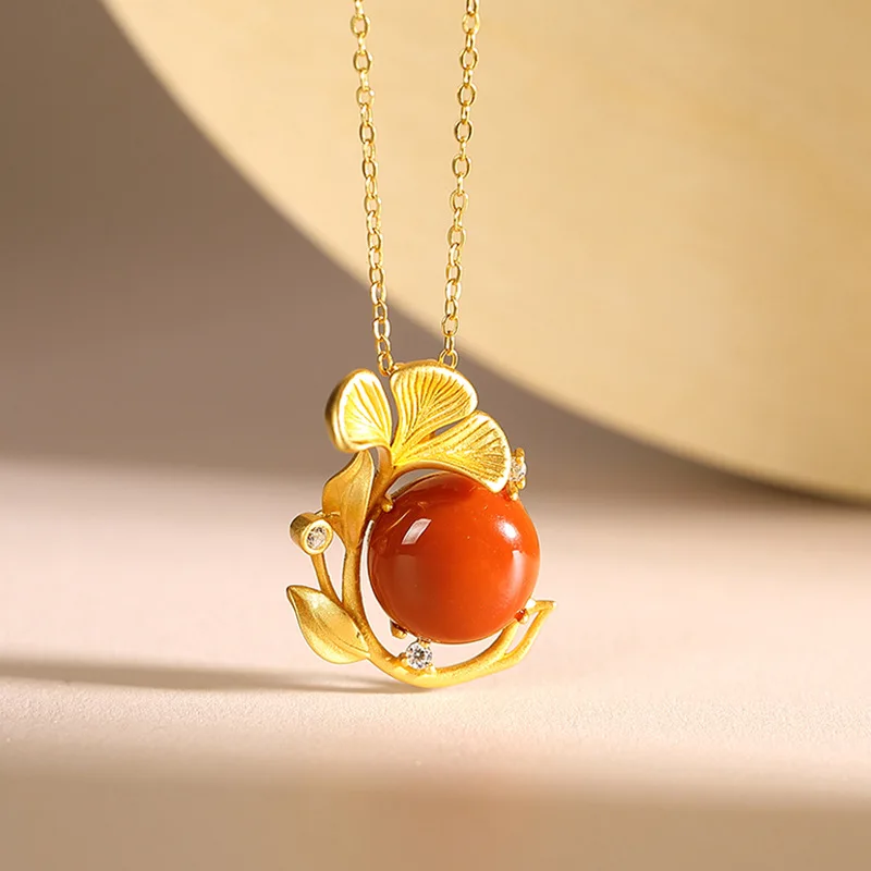 Offer Description of LATS Natural Red Agate Vintage Pendant Necklace 925 Sterling Silver Gold-plated Ginkgo Leaf Necklace for Women 2020 Fine Jewelry