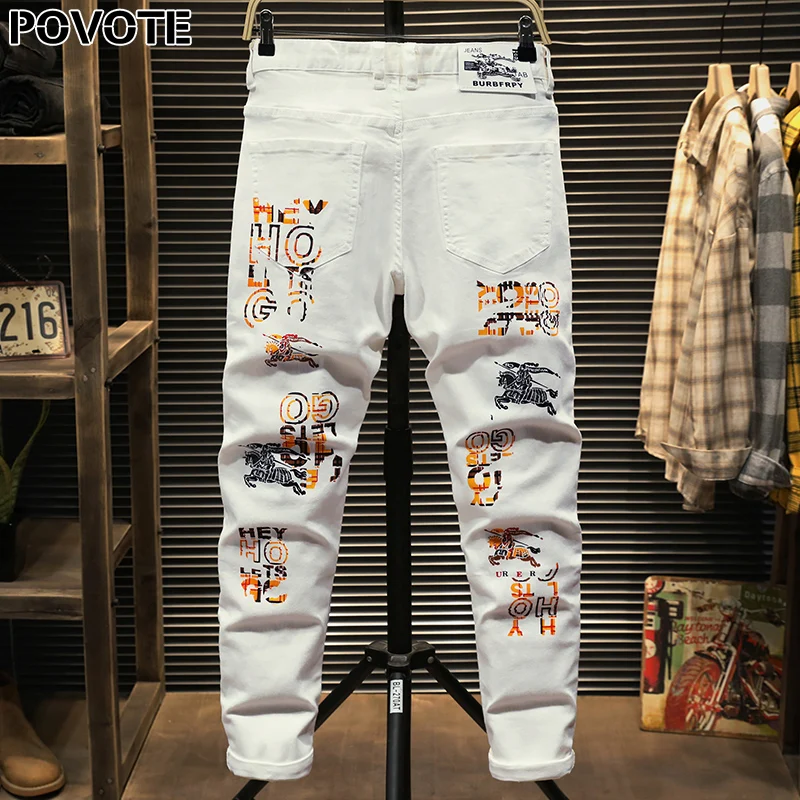 POVOTE jeans men's hip hop trend pants slim pencil pants men's jeans locomotive jeans cartoon embroidery trend design