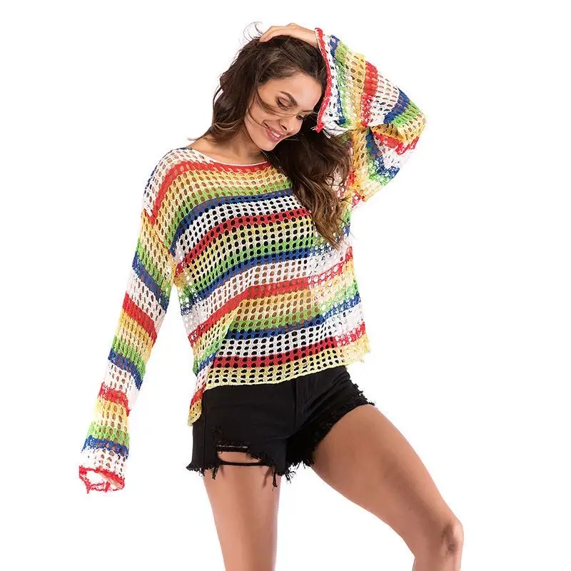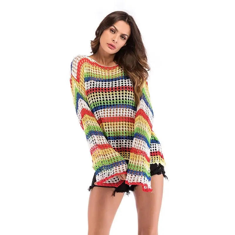 Limited Chance for Women Sweaters 2020 Spring Summer Casual Loose Rainbow Stripe O-Neck Knitted Sweater Hollow Color Collision Pullovers Tops