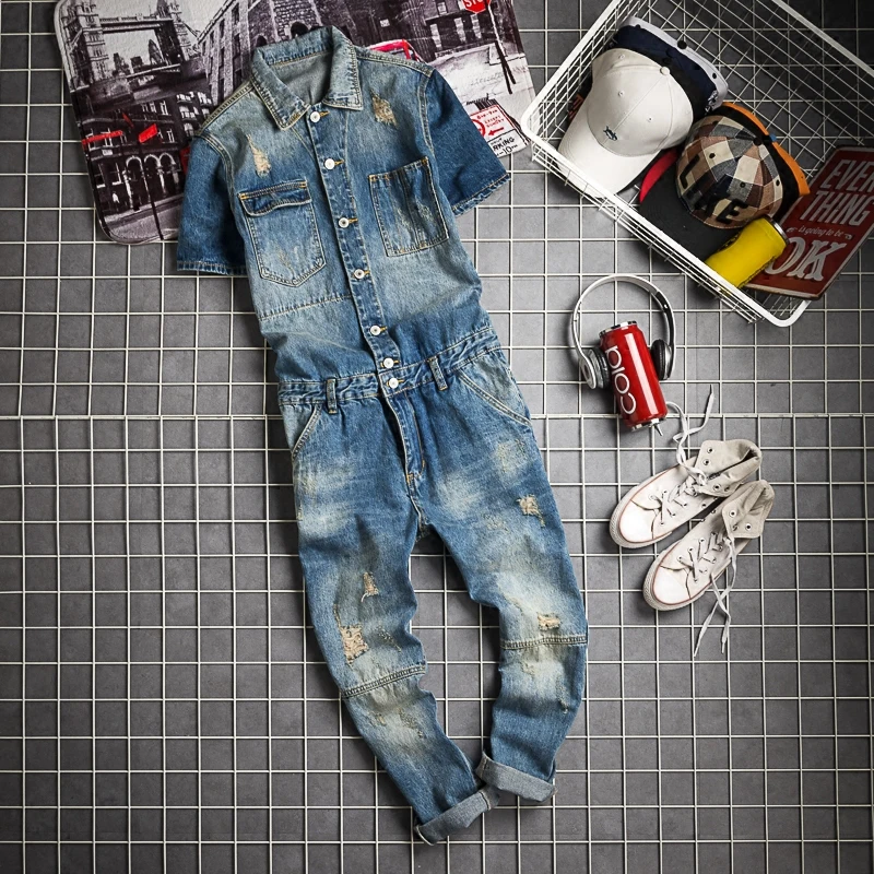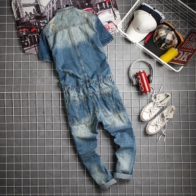 .Gallery for Men's Short Sleeve Denim Overalls Men Casual Ripped Jeans Jumpsuit One Piece Jacket Trouser Male Workwear Denim Bib Coverall