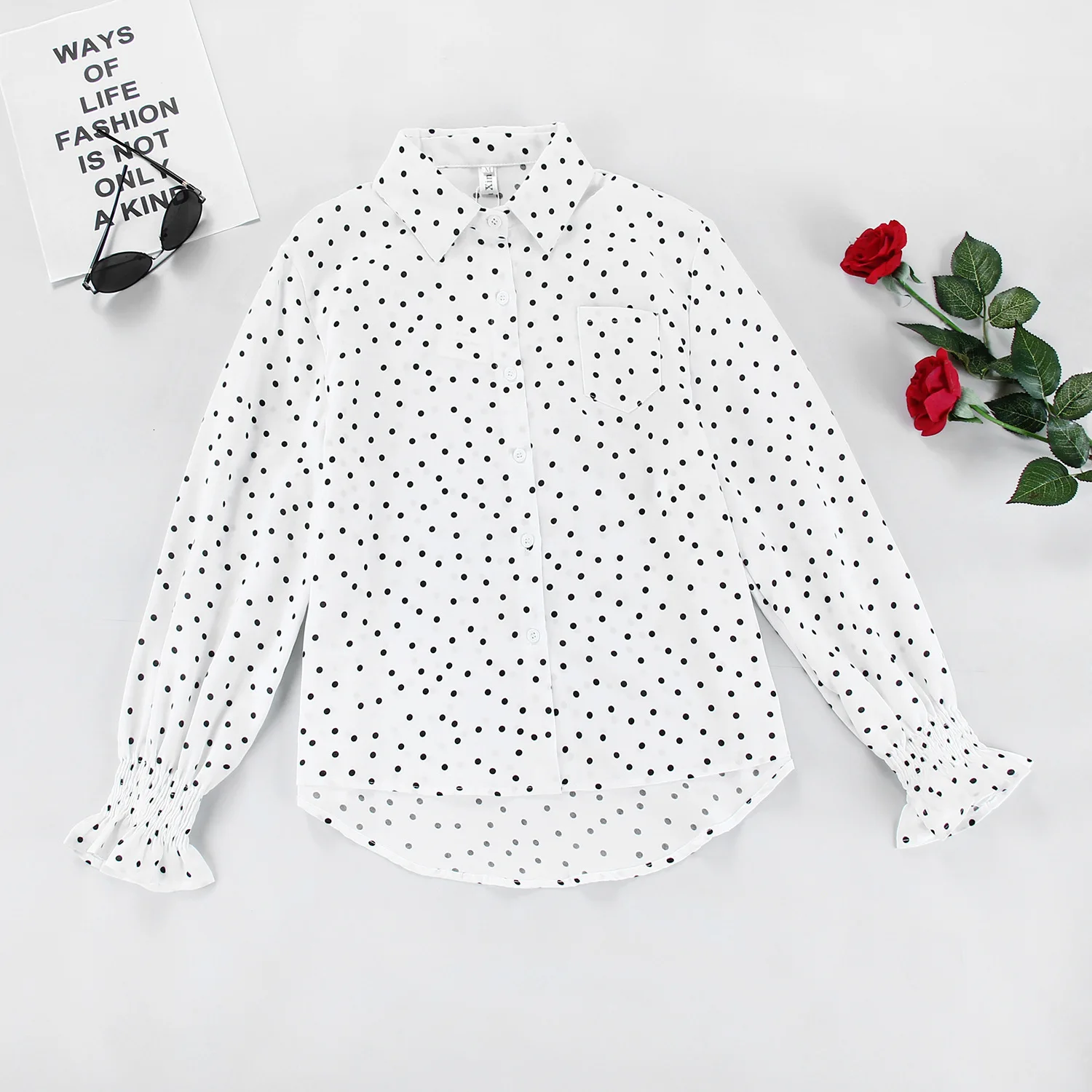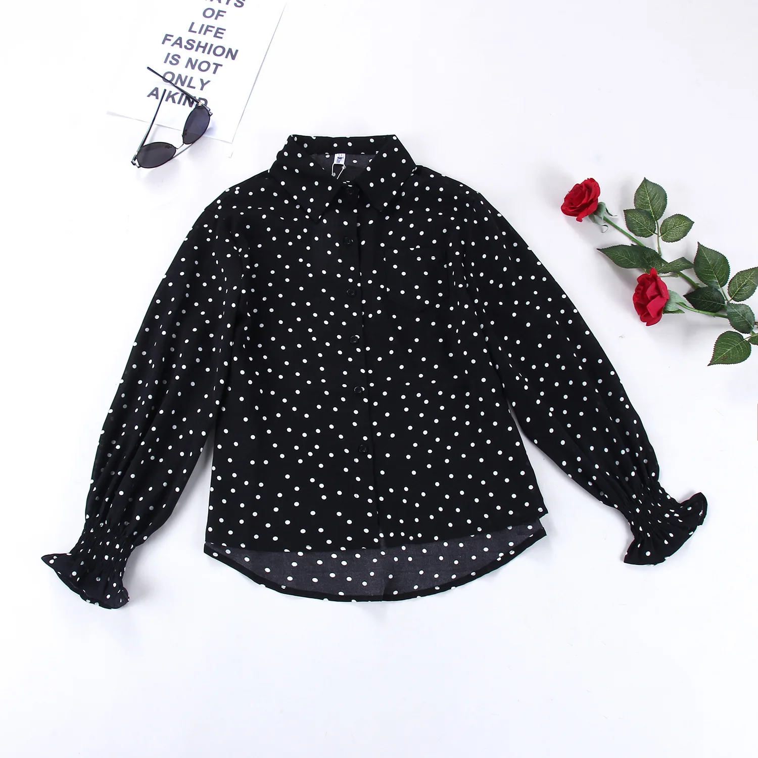 Addition Information of New Autumn Women Chiffon Blouses Casual Loose Dot Single-breasted Shirt Lapel Ruffles Sleeve Ladies Tops 2020 Bluzki Damskie