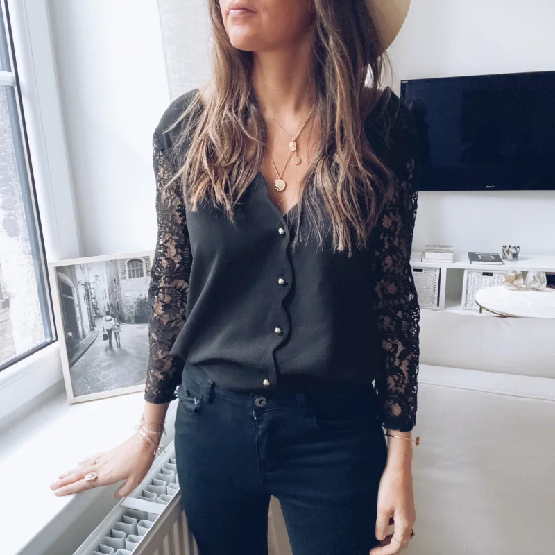 Price Description of Plus size lace women blouses 2020 summer new solid color sexy blouses top V-neck button long sleeve women shirts