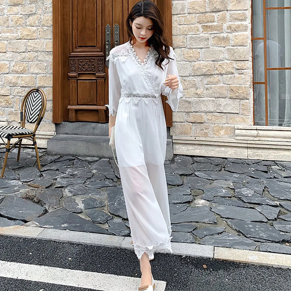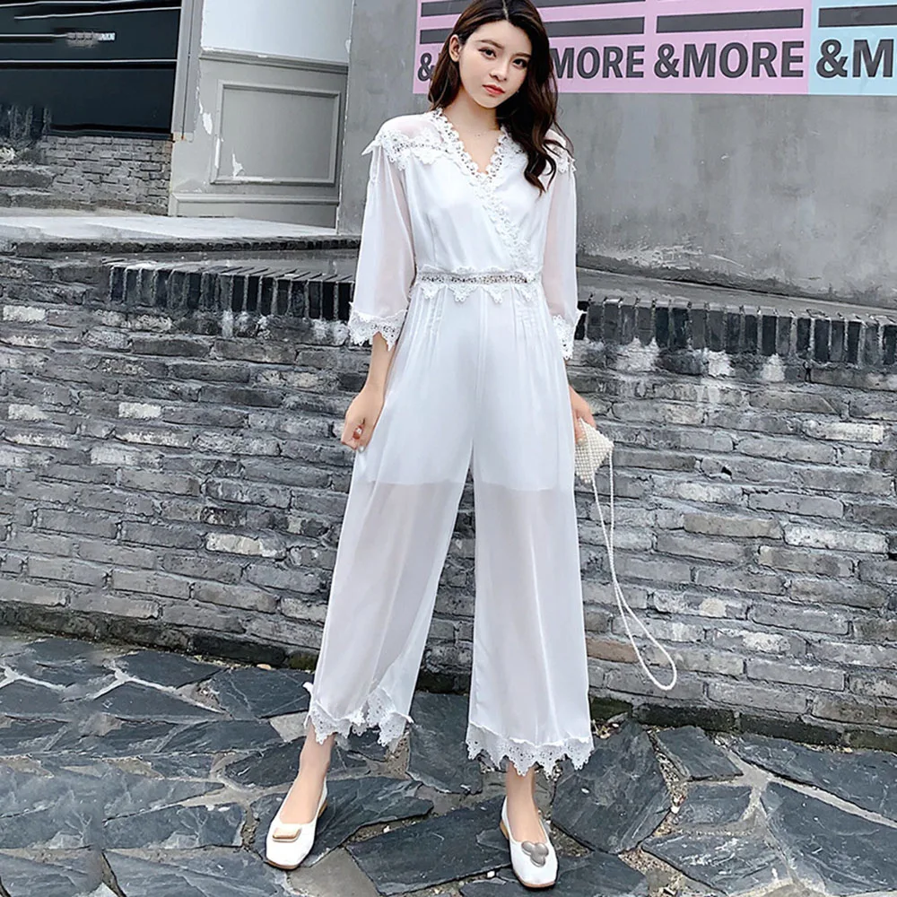 Chance Description of Elegant Office Ladies Lace Jumpsuit Korean Summer Girl Sweet Solid White See Through Causal Party Romper Playsuits Japan Dating