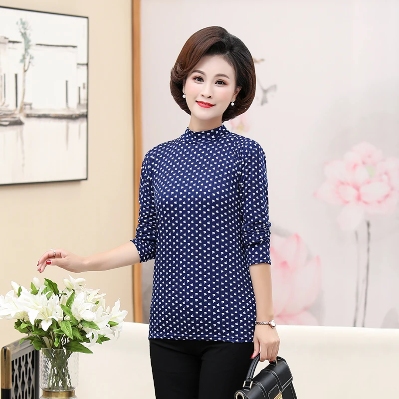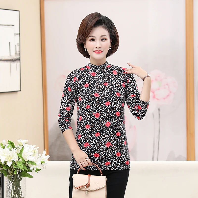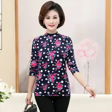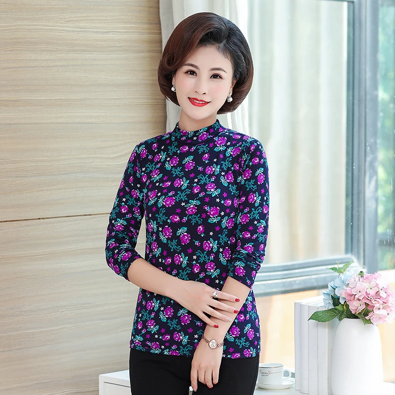 .Gallery of Middle Aged Women Flower Printing Blouses Half Collar Long Sleeve Slim Fit Plus Size Top Red Blue Black Floral Blouse Mother New