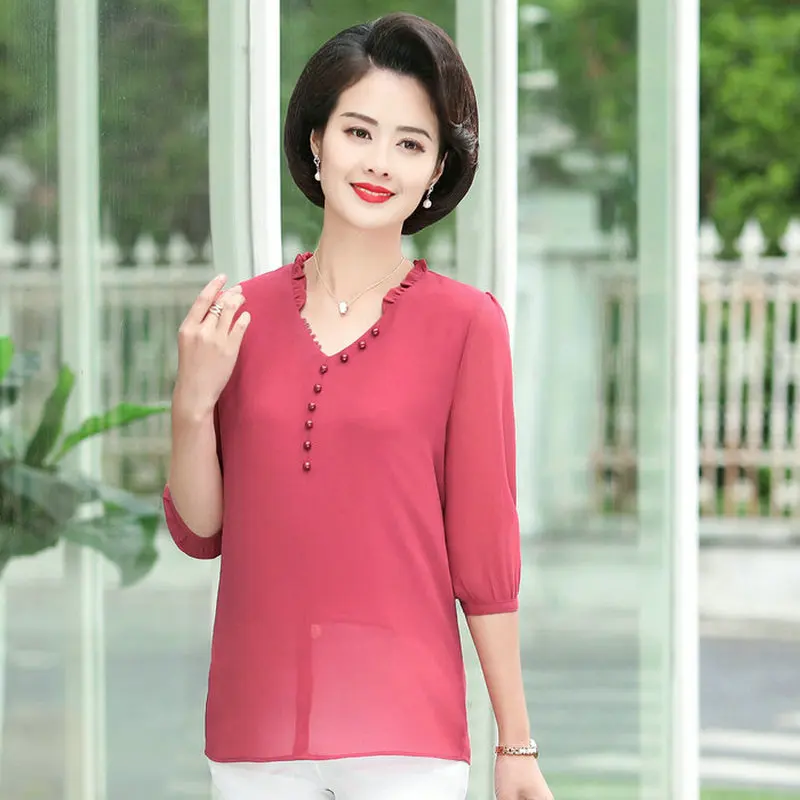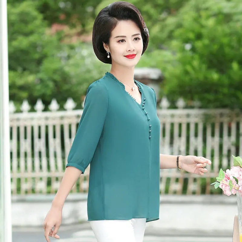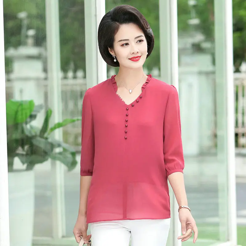 .Images of Red Green Chioon Blouse Woman Summer Spring Half Length Sleeve V-neck Thin Crepe Tops Women Elegant NIne Button Front Blouses