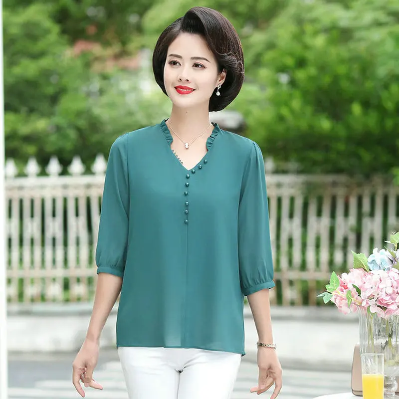 Chance Description of Red Green Chioon Blouse Woman Summer Spring Half Length Sleeve V-neck Thin Crepe Tops Women Elegant NIne Button Front Blouses