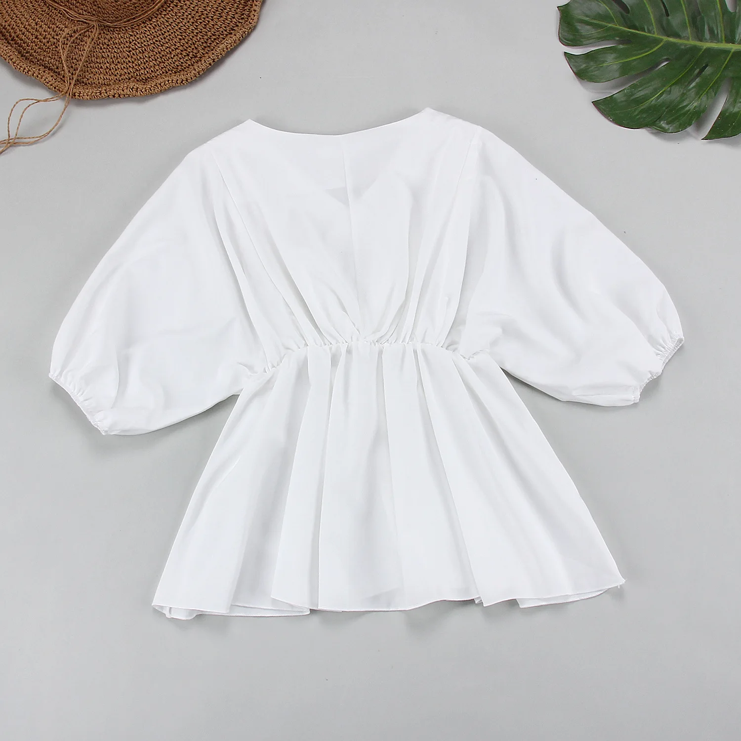 .Gallery of Summer V Neck Chiffon Shirt Lantern Sleeve Elastic Women Simple White Blouse Ladies Comfy Casual Tops New 2020 Blusa Feminina