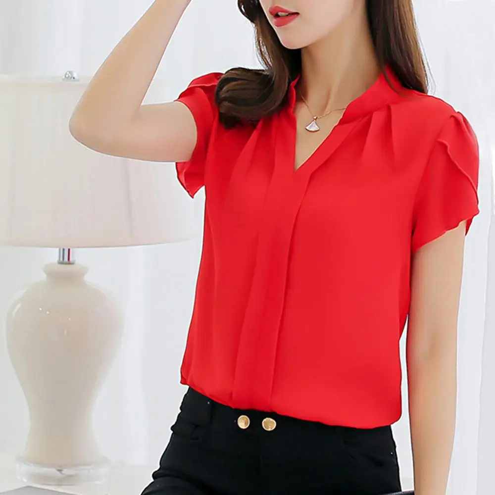 Good Offer of Women Summer Work Office V Neck Short Sleeve Solid Chiffon Blouses Office Shirt Lady Shirt Blusas Camisa blusas mujer de moda