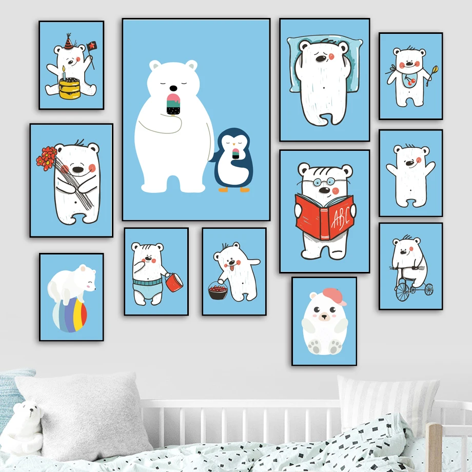 Chance Description of Little Bear Penguin Cake Book Flowers Wall Art Canvas Painting Nordic Posters And Prints Wall Pictures Baby Kids Room Home Decor