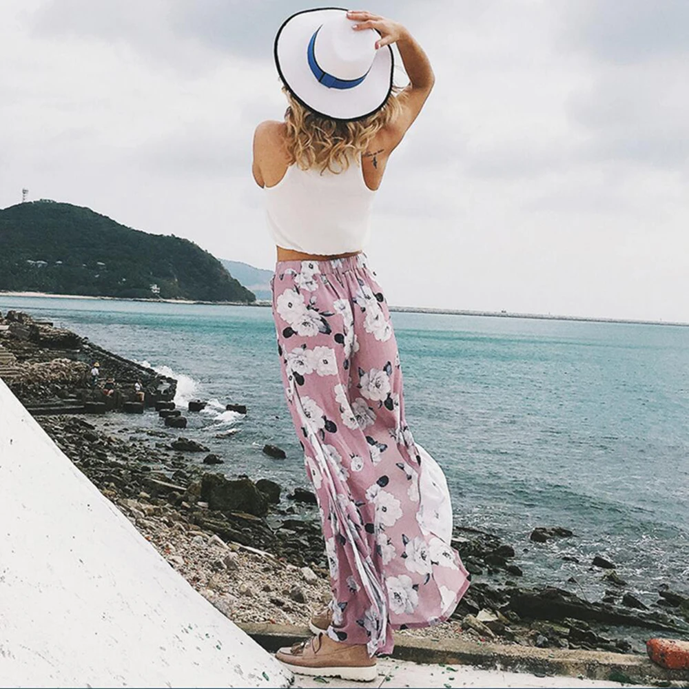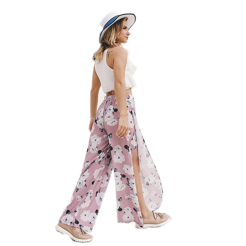 .Pictures of women loose baggy pants large size chiffon slastic waist sides open casual pants wide leg pant floral print beach pantalettes