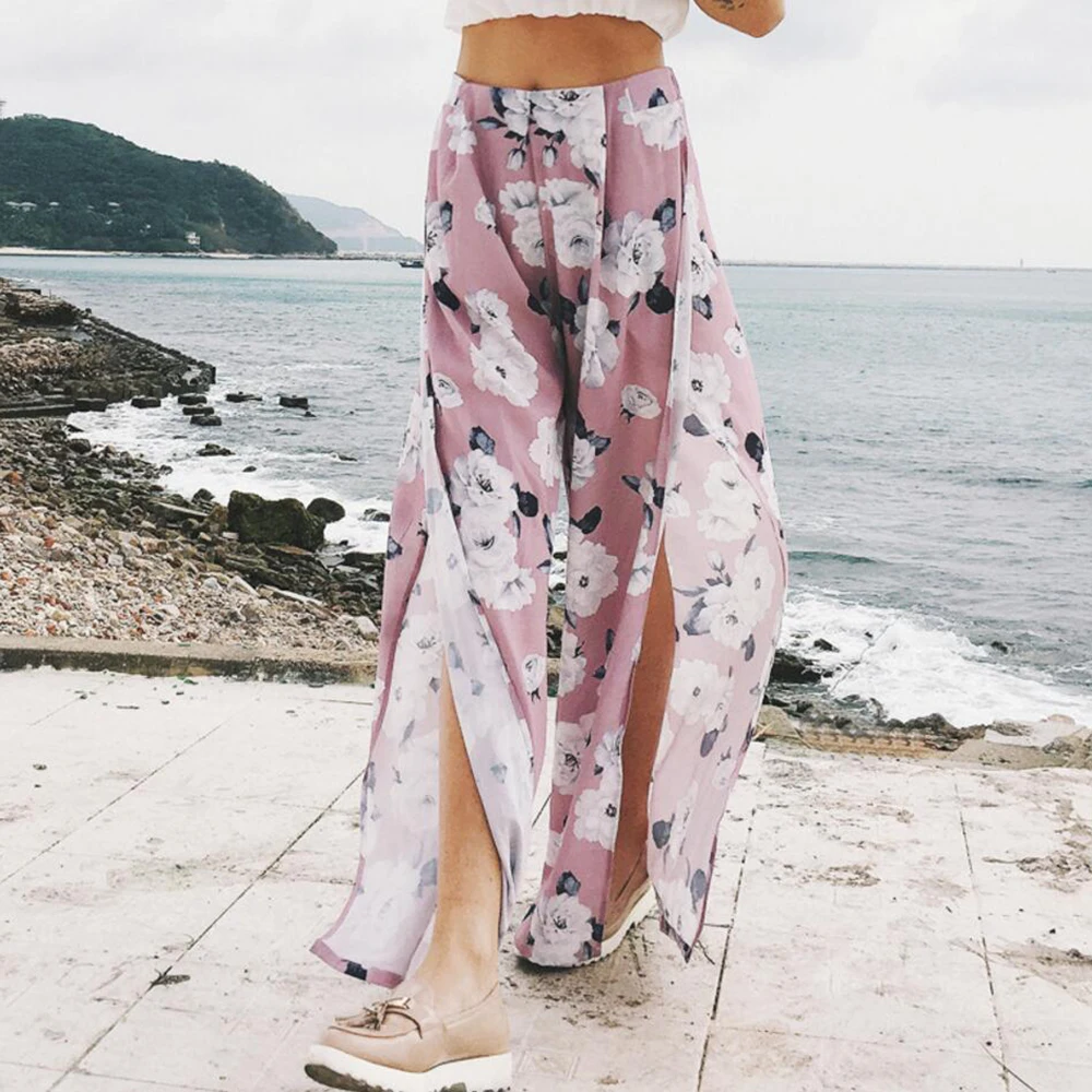 Best women loose baggy pants large size chiffon slastic waist sides open casual pants wide leg pant floral print beach pantalettes Free Shipping